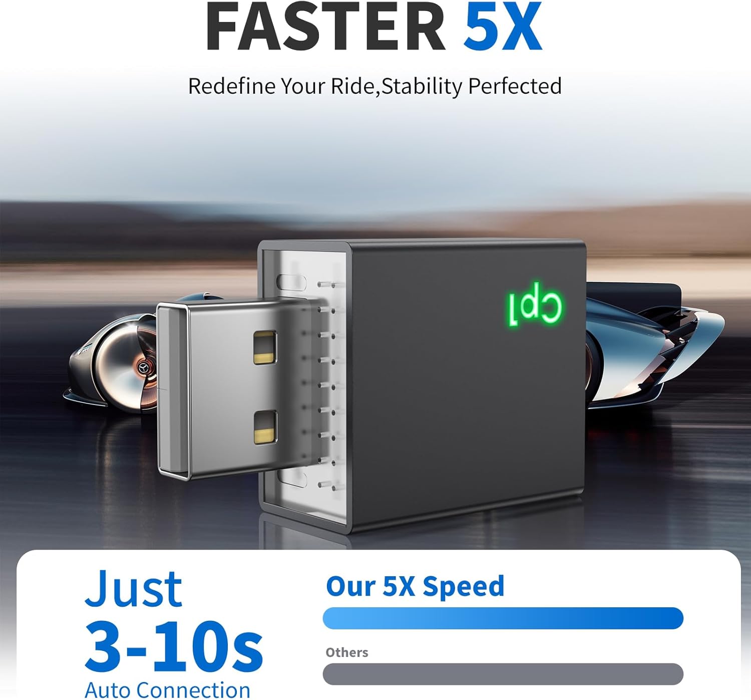 - š Stable & Ultra-Low Lag Connection:Unlike other apple carplay wireless adapter that suffer from disconnections or lag, our advanced 5.8GHz WiFi and Bluetooth 5.X ensure ultra-fast response times. Less than 1 second delay for music, navigation or calls, which even on bumpy roads, the connection stays rock-solid, keeping your drive smooth.