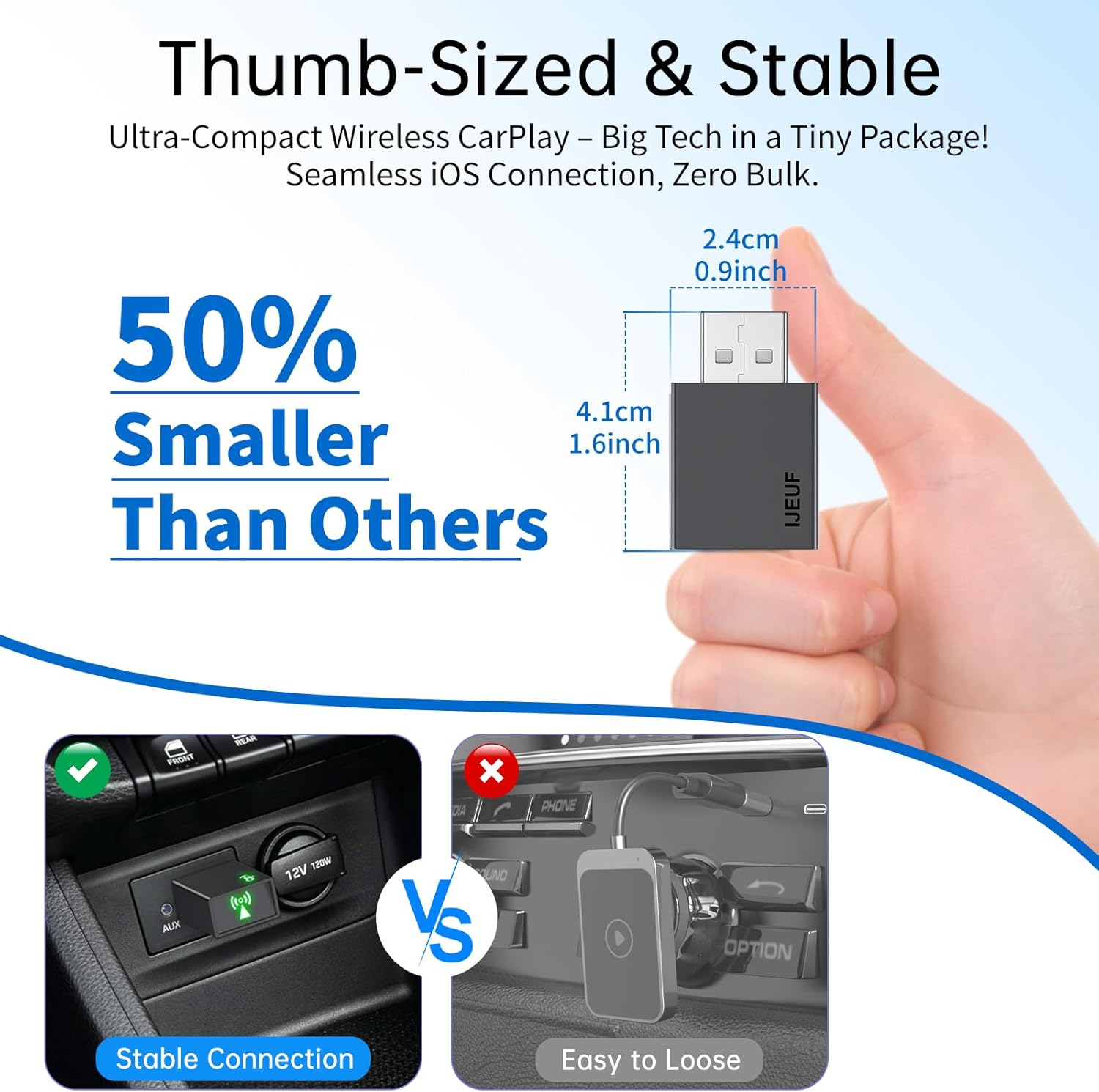 - š”Mini and Practical: The bluetooth apple carplay adapter USB port has been tested for over 10,000 insertions for durability, while the flame-retardant shell and automotive-grade chip meet American Automotive Electronics Council (AEC) standards, Resistant to heat and vibration in the car,significantly improved driving safety. Its mini size (50% smaller than other brands) allows it to fit snugly into tight spaces, keeping your car neat and clutter-free.
