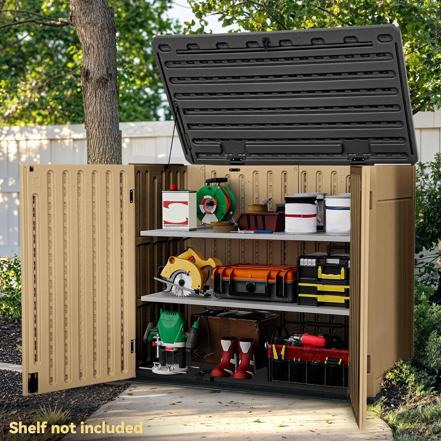 - Robust Construction: Boasting double-wall resin panels treated with cutting-edge technology, this outdoor storage solution offers enhanced wind and impact resistance; Its sturdy build ensures your valuable tools and equipment remain secure, without bending or puncturing