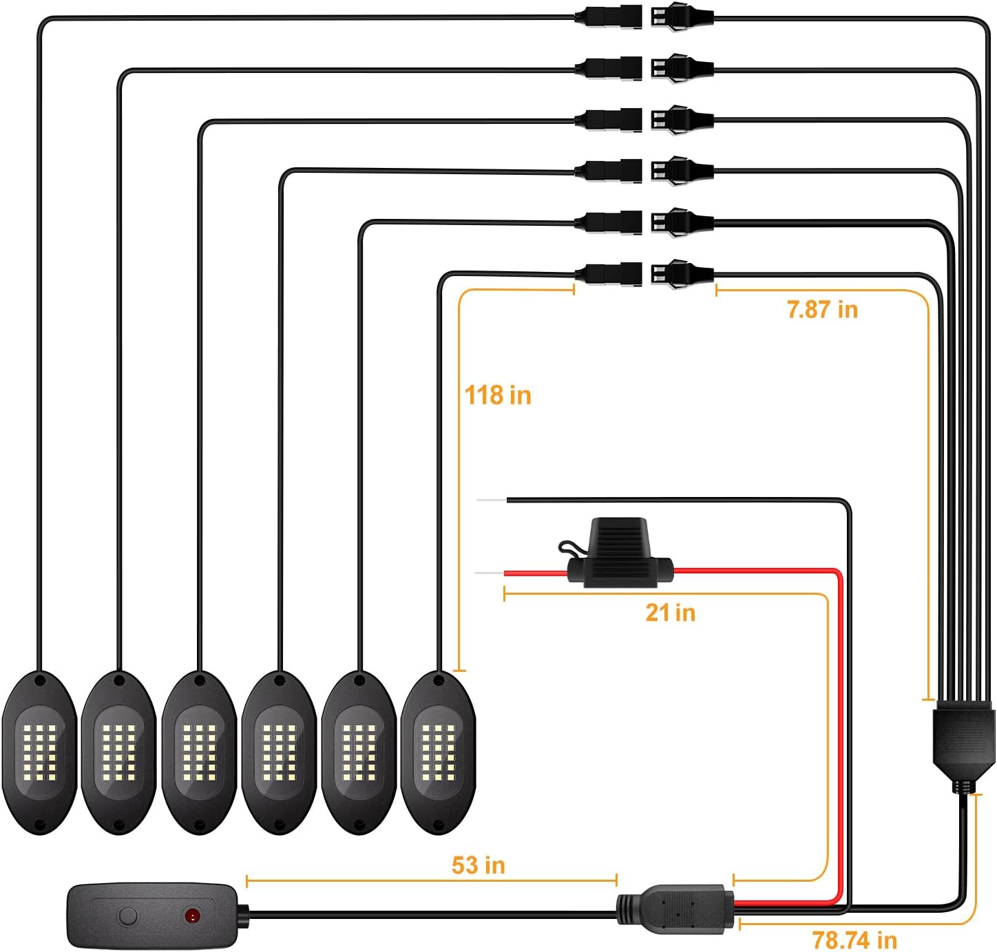 - ăEach Pod Wired is 118 inchesăEach pod comes with a cable length of 118 inches. IIf you want to decorate a large vehicle, you may need to add additional extension cords. Please search for ASIN: B0DLSL74CC on Amazon to add more, this extension wire is plug and play, specifically compatible with Honalia white rock lights for trucks