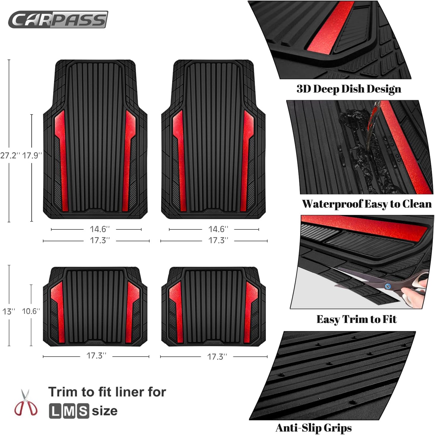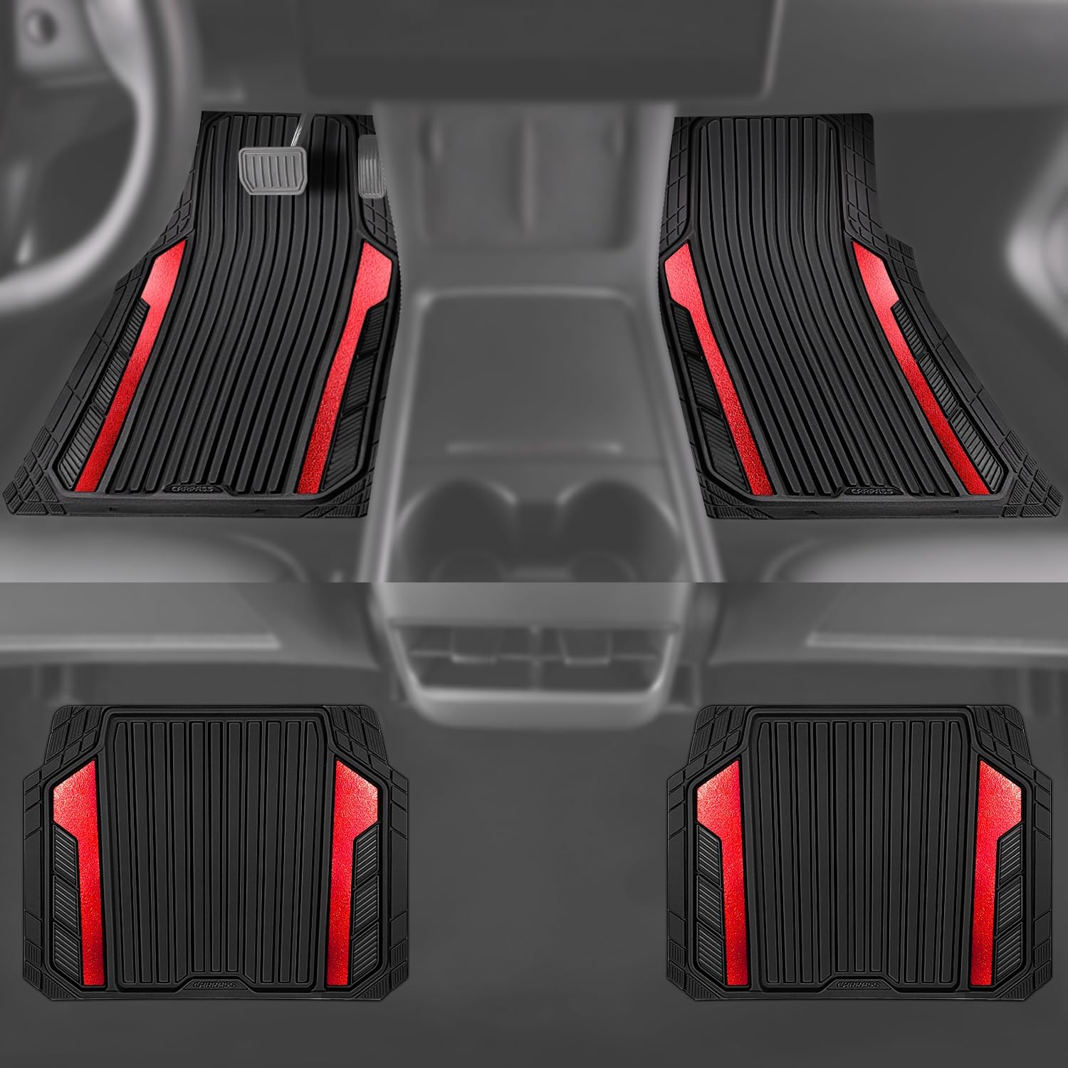 CAR PASS Heavy Duty Rubber Car Mats Metallic, Aluminum Film All Weather Floor Mats Waterproof Universal Trim to Fit Automotive SUV Sedan Van 4 Piece Anodized Deep Dish Two-Tone Sporty Black Red Chrome