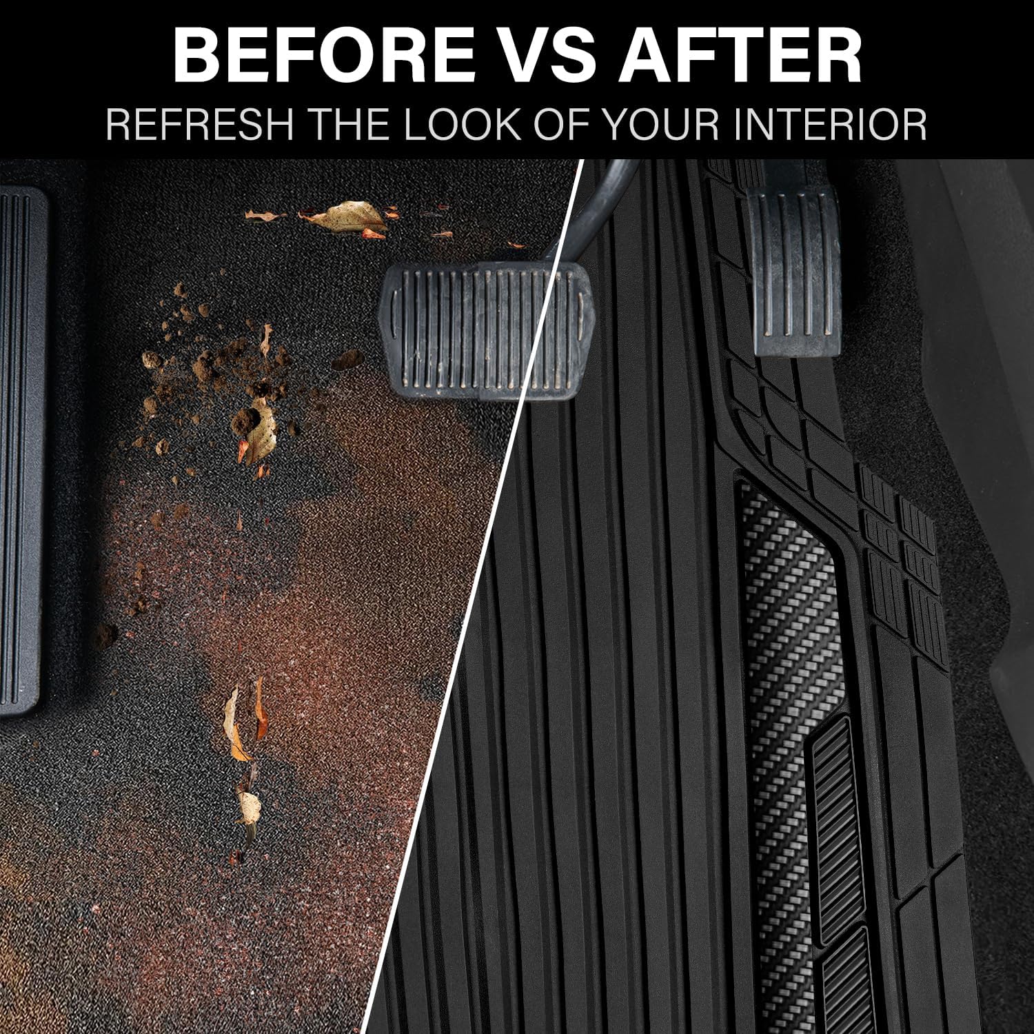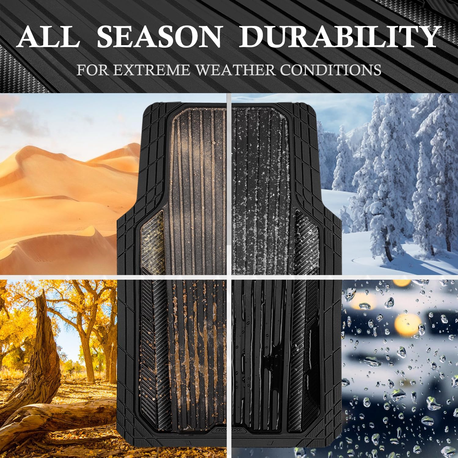 - ăAll Weather All Season ProtectionăCAR PASS heavy duty rubber car mats use for all season.Ridge channels specifically design to prevent fluids from leaking onto carpets,the deep channels also trap any mud, dirt, water or snow that gets in your car.
