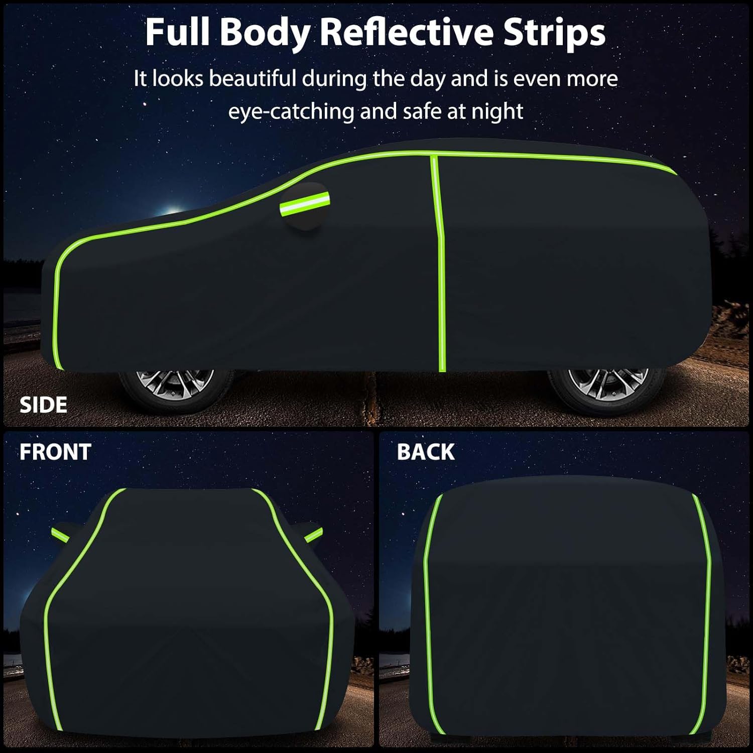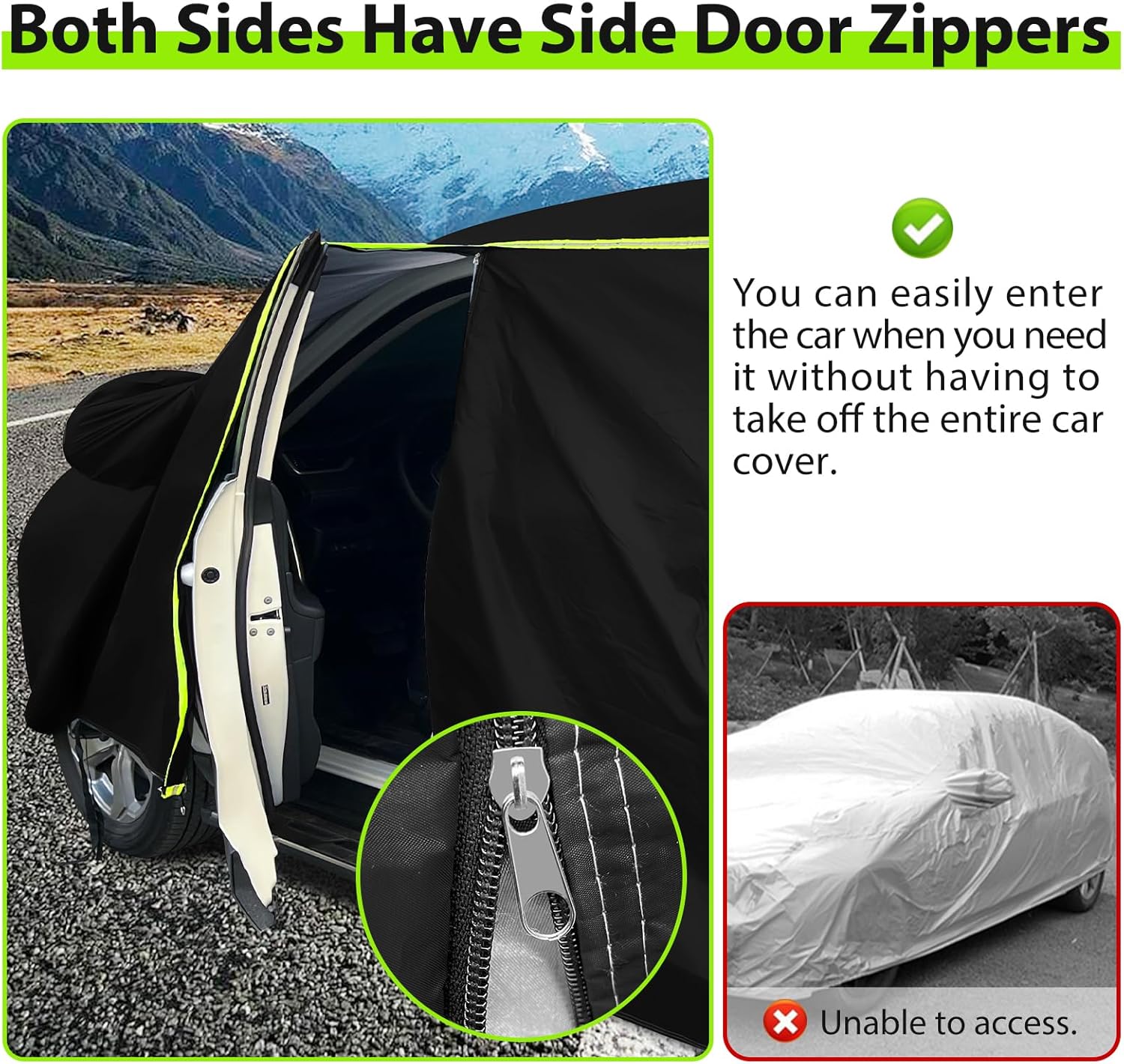 - Personalized Design:The car cover features door zippers on both sides, allowing you to easily access your car’s contents without having to remove the cover.The vehicle cover is equipped with green reflective strips, enhancing visibility for pedestrians and other vehicles by outlining your car in low-light conditions.