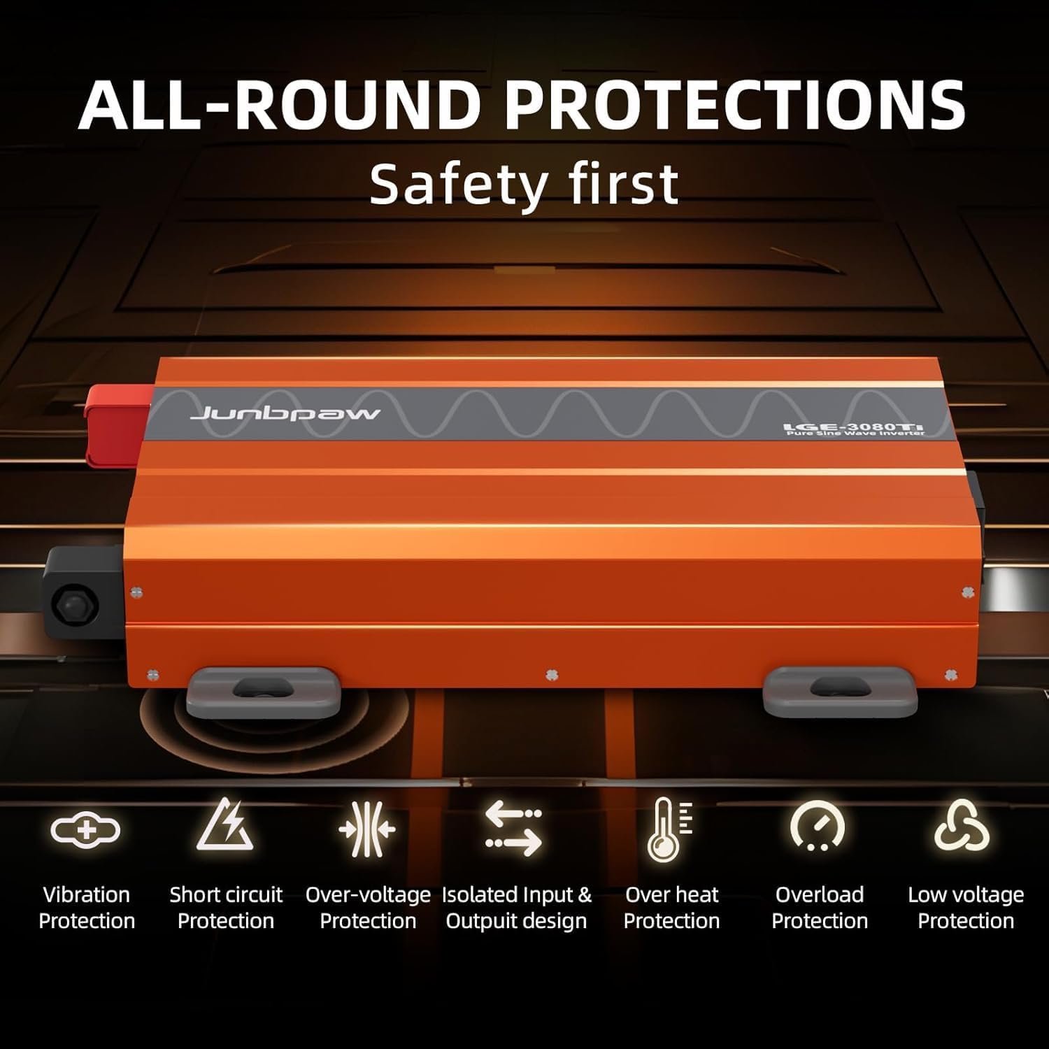 - 【High-Performance Solid-State Capacitors】The Junbaw 3080W inverter utilizes high-quality solid-state capacitors, making it ideal for high-temperature, high-load environments. It is less prone to power fluctuations from temperature changes, ensuring a longer lifespan.