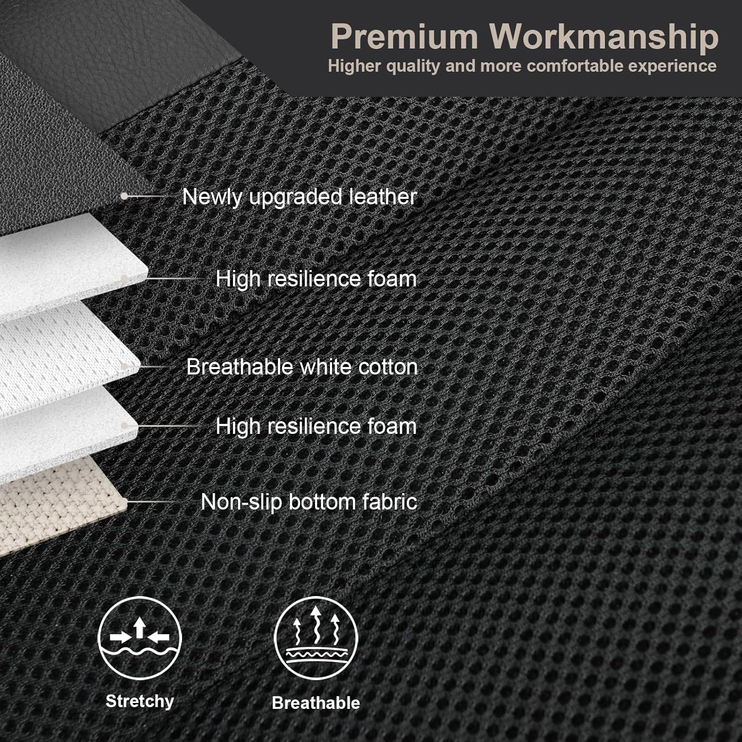 - ăMaterialsă Our car seat covers combine premium faux leather with breathable mesh fabric. The faux leather provides a luxurious look and durability, while the honeycomb mesh design on the backrest and seat ensures excellent breathability and cooling keeping you comfortable during long drives and in hot weather