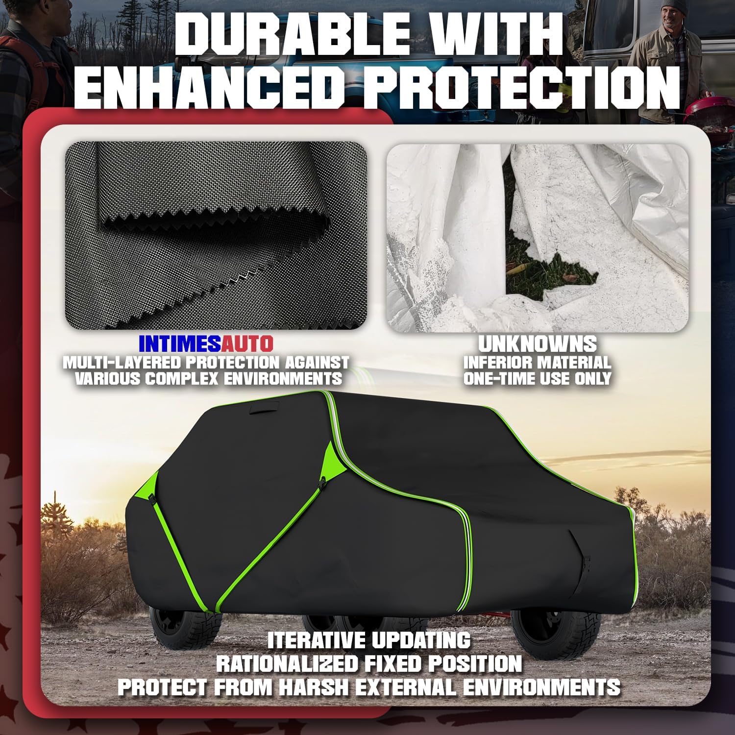- DESIGNED FOR OUTDOOR PROTECTION: The InTimesAuto 4 wheeler cover is crafted from durable 6-layer oxford cloth with reinforced stitching, offering exceptional cover waterproof outdoor performance. This outdoor heavy duty cover provides 100% waterproof heavy duty protection, shielding your side by side UTV from dust, snow, rain, and other harsh weather conditions. Perfect for outdoor season use, it ensures secure outdoor protection and waterproof outdoor storage for most UTV models.
