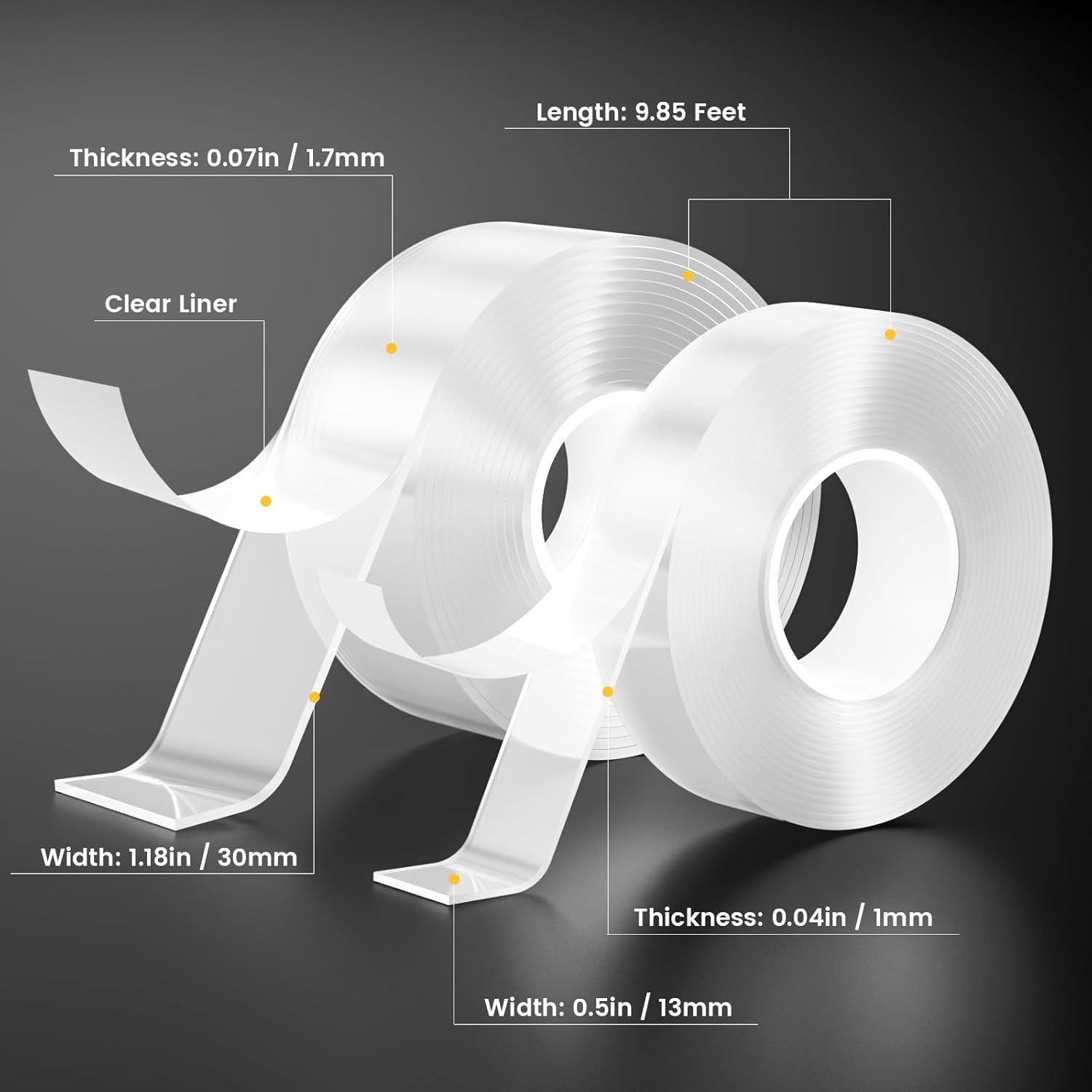 - Enhance your home projects with nano double sided tape: This heavy duty adhesive tape is long lasting and versatile, perfect for a wide range of applications. The 19.7 feet in total length and two size widths (0.5inch+1.18inch) provide you with plenty of tape to work with.