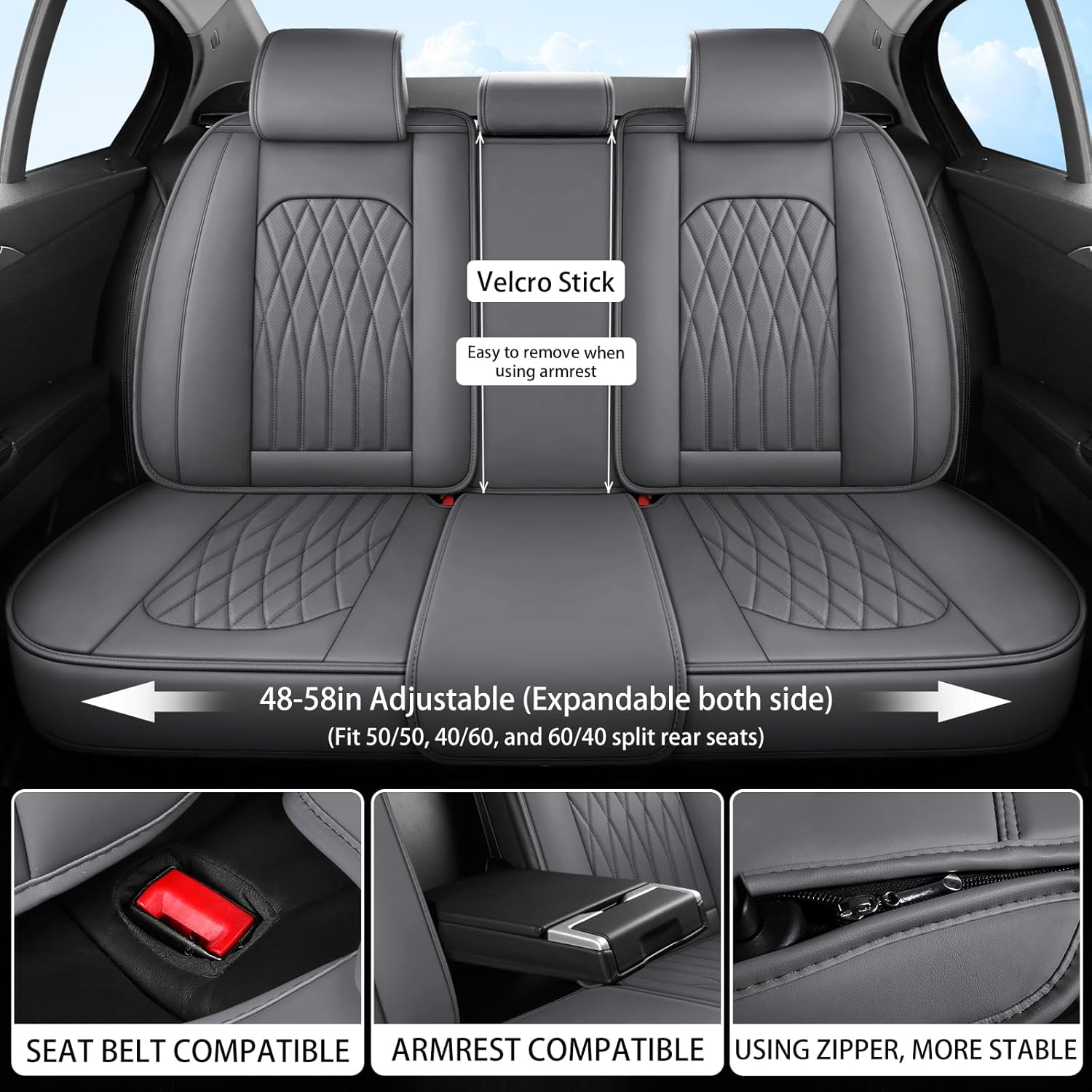 - UNIVERSAL FIT: The seat covers are compatible with most cars, SUV, pick-up and trucks. Unfold the car seat covers package, you will get 2 front and 3 rear seat covers. Once put on seat covers, the vehicle interior atmosphere instantly becomes high-end and atmospheric. You will immediately fall in love with faux leather car seat covers. Note: Car seat covers full set don't fit seats with fixed armrest.