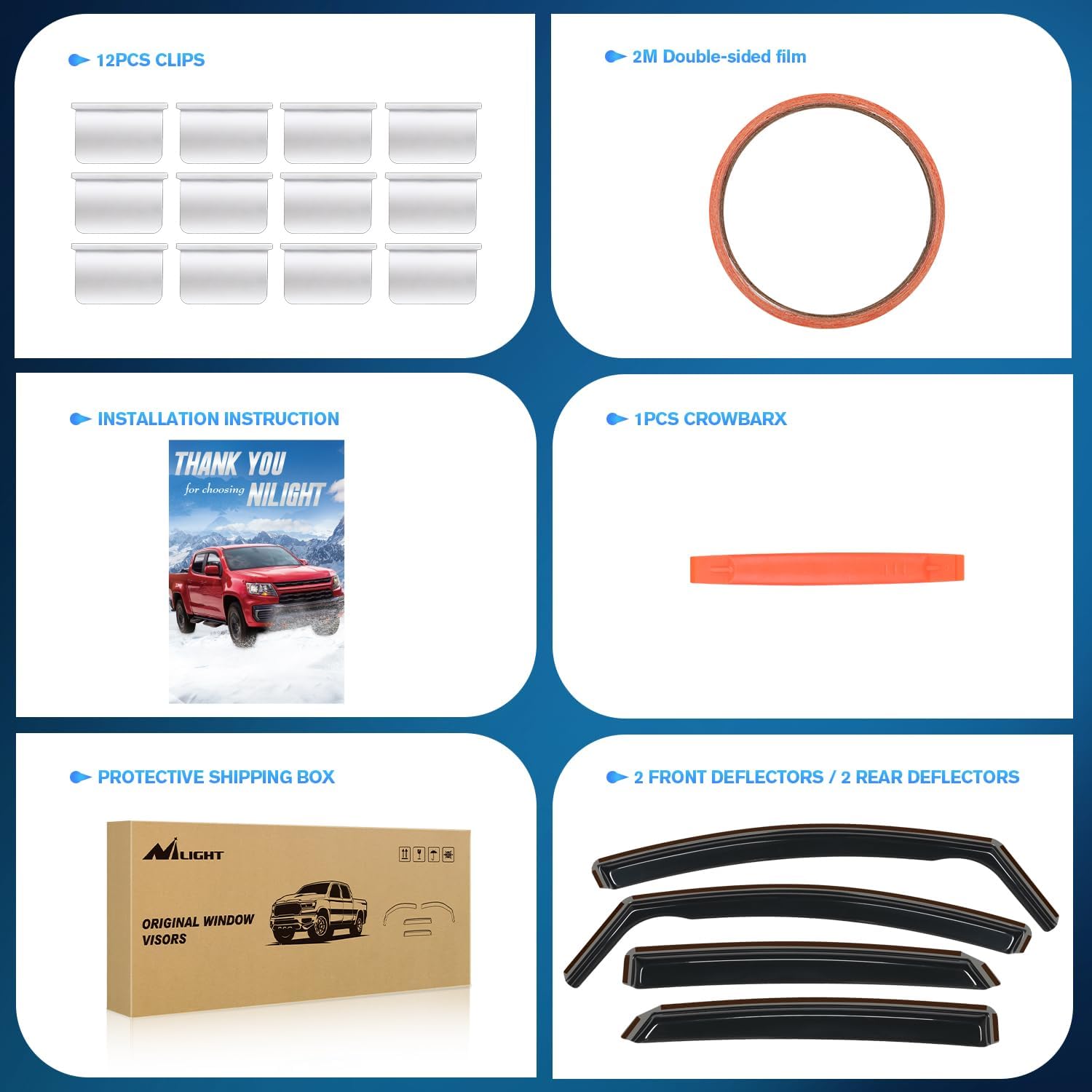 - PACKAGE INCLUDED:4 PCS Rain Guards,12pcs clips,Crowbar 1pcs,78inch double-sided tape and installation instruction