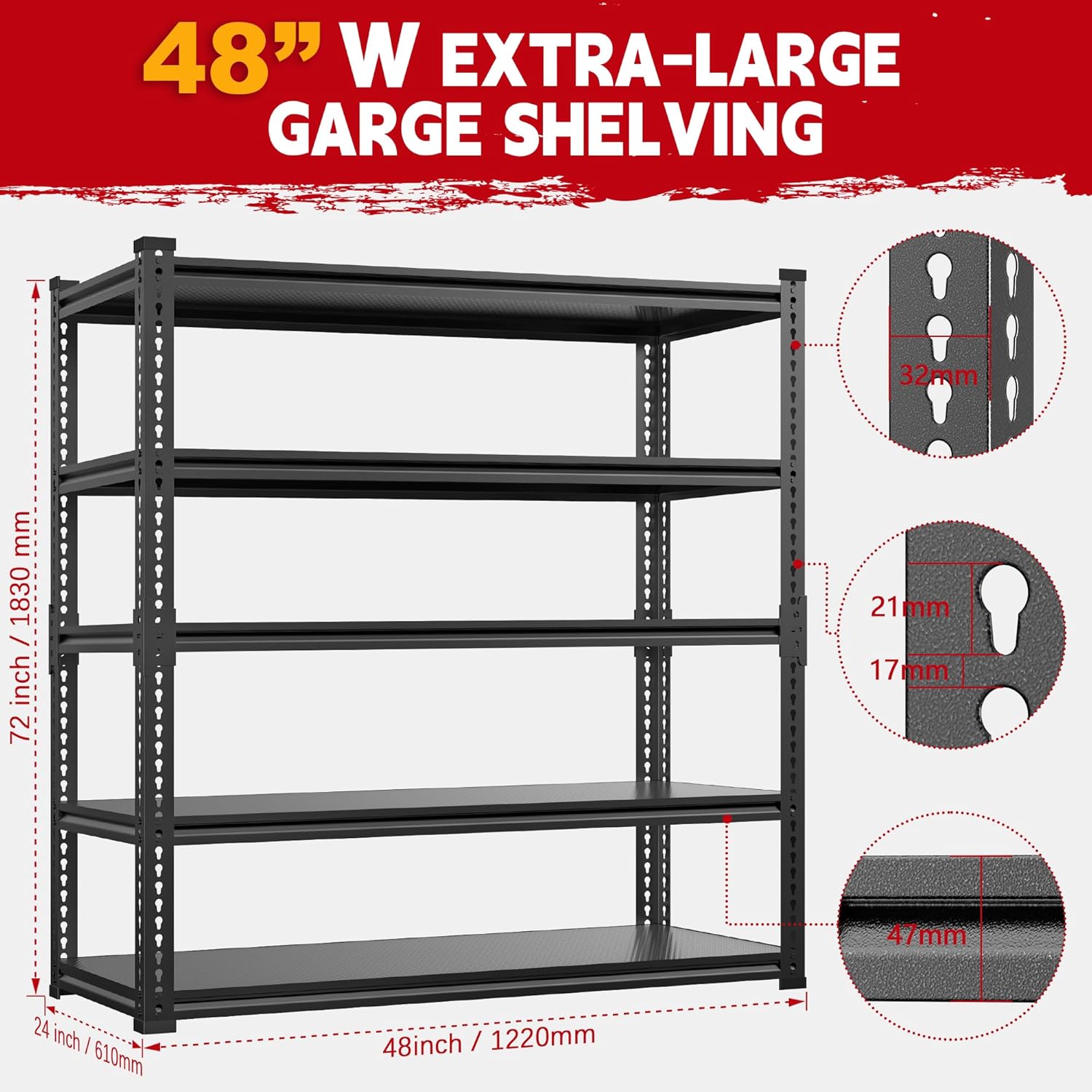 48" Wide Garage Shelving Heavy Duty 3000LBS, 5 Tier Adjustable Storage Rack, 72" H x 48" W x 24" D Boltless Shelving Unit for Garage, Warehouse, Basement, Workshop