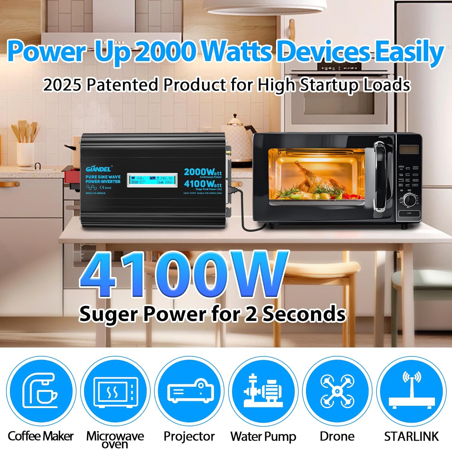 GIANDEL 2000 Watt Pure Sine Wave Power Inverter 12V DC to 120V AC,4100W Surge Peak Power,UL Listed GFCI Outlets,FCC Approved,USB-C36W,Remote with Battery Monitor for RVs,Campers,Off Grid Solar Setup