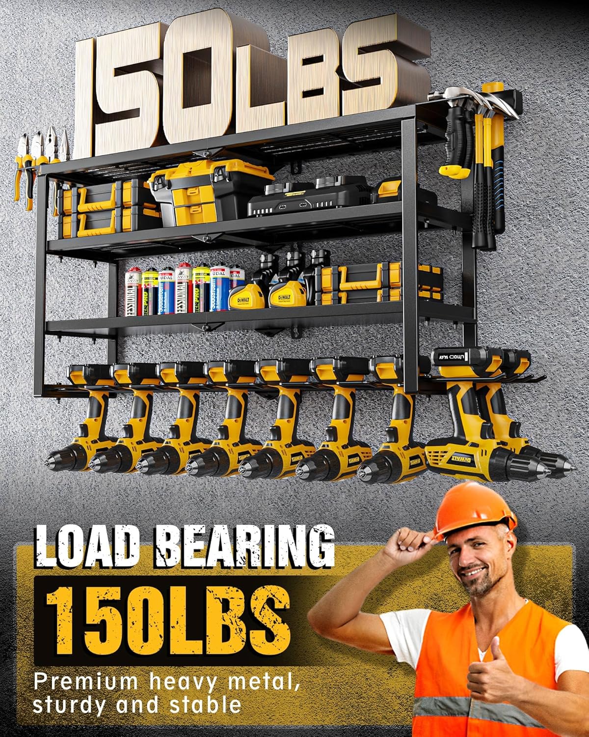 - LOAD BEARING 150 LBS: Our tool organizer is made of premium heavy metal, featuring durability, pressure resistance. It comes with 8 wall anchors to make the rack more sturdy and stable. After extensive load testing, each layer can support up to 37 LBS