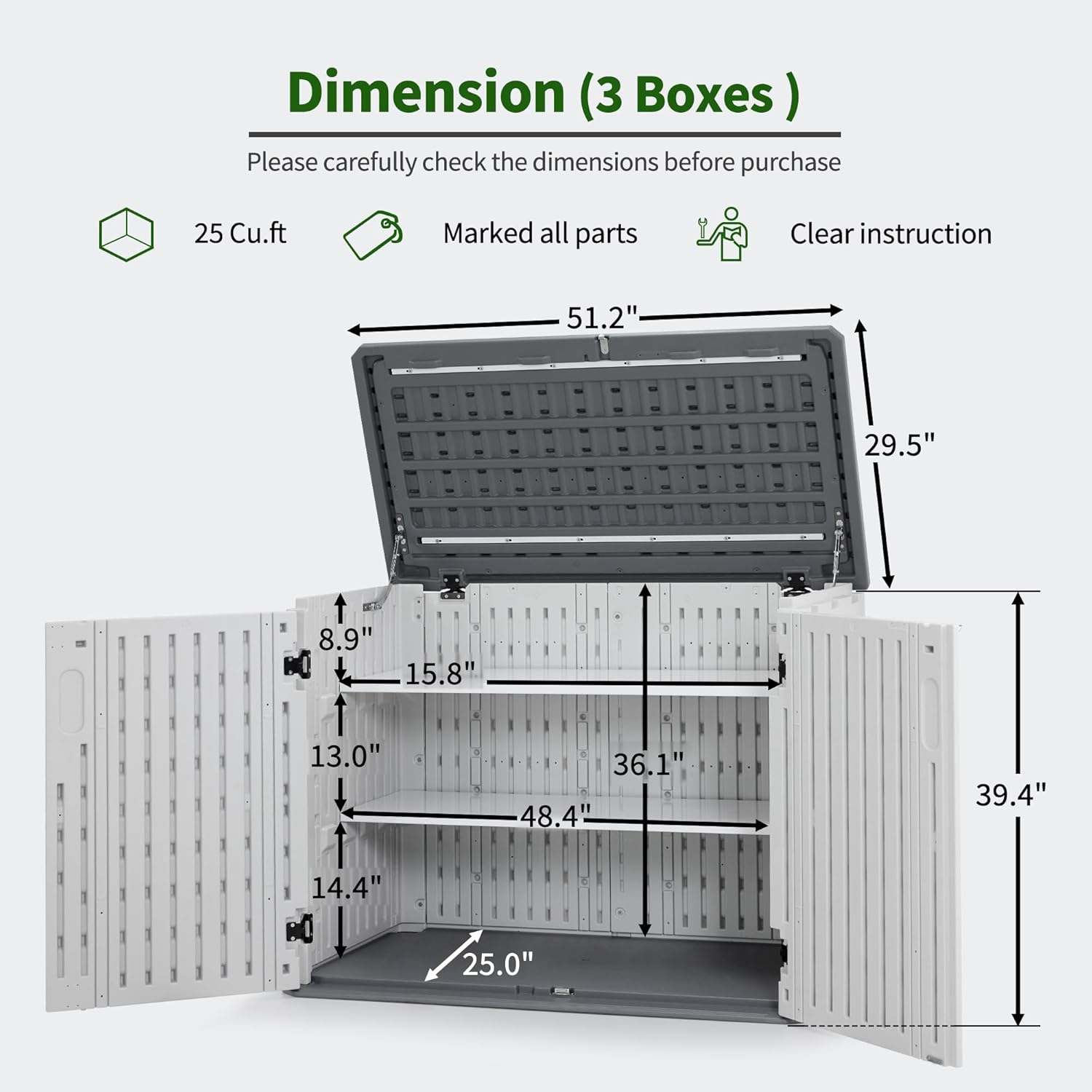 - Plastic Shed: Overall Dimension: 52.16 (W) x 28.34 (D) x 38.58 (H) inch; Internal Dimension: 48.43 (W) x 25.00 (D) x 36.10 (H) inch