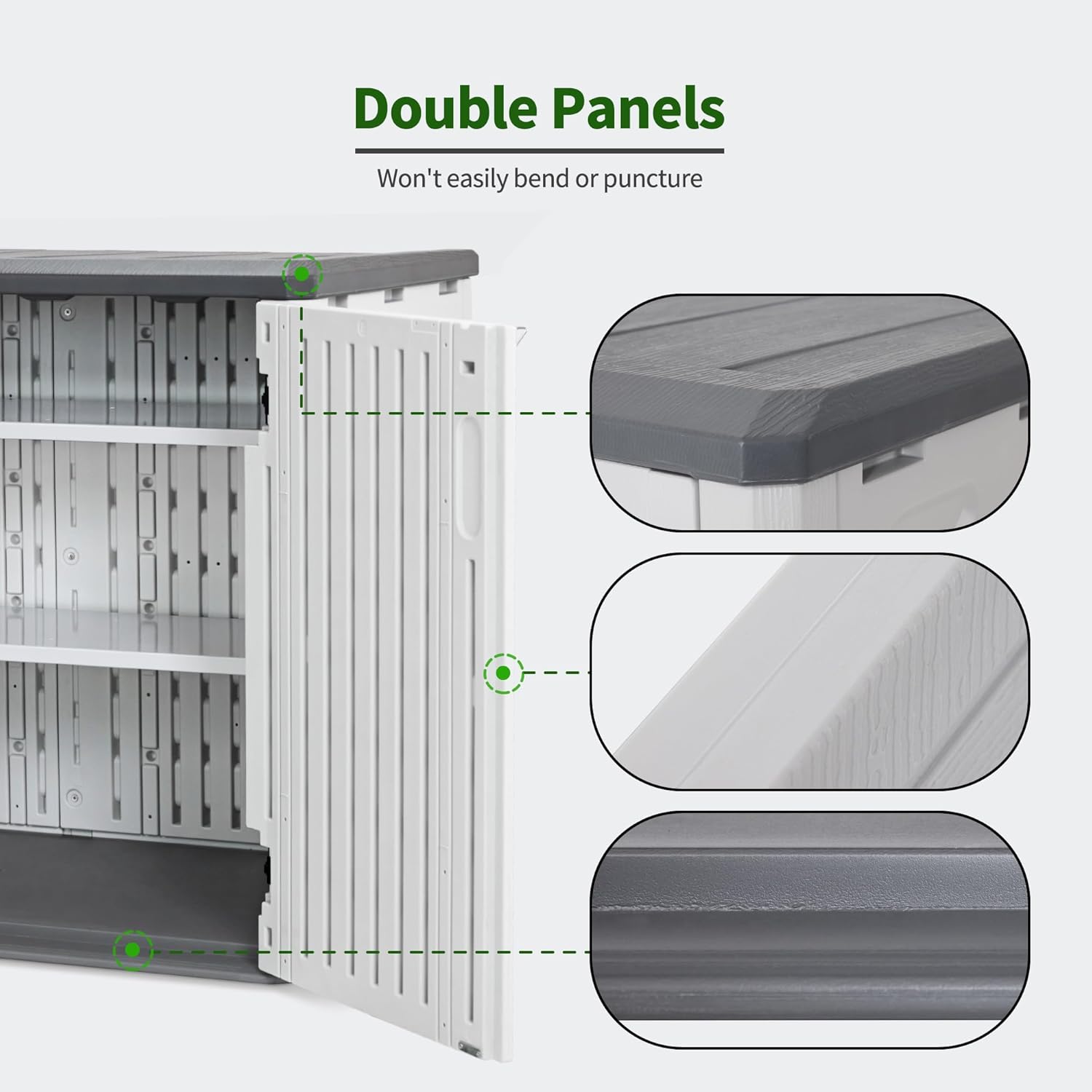 - Double Panels: The shed outdoor storage features double panels that won't easily bend or puncture