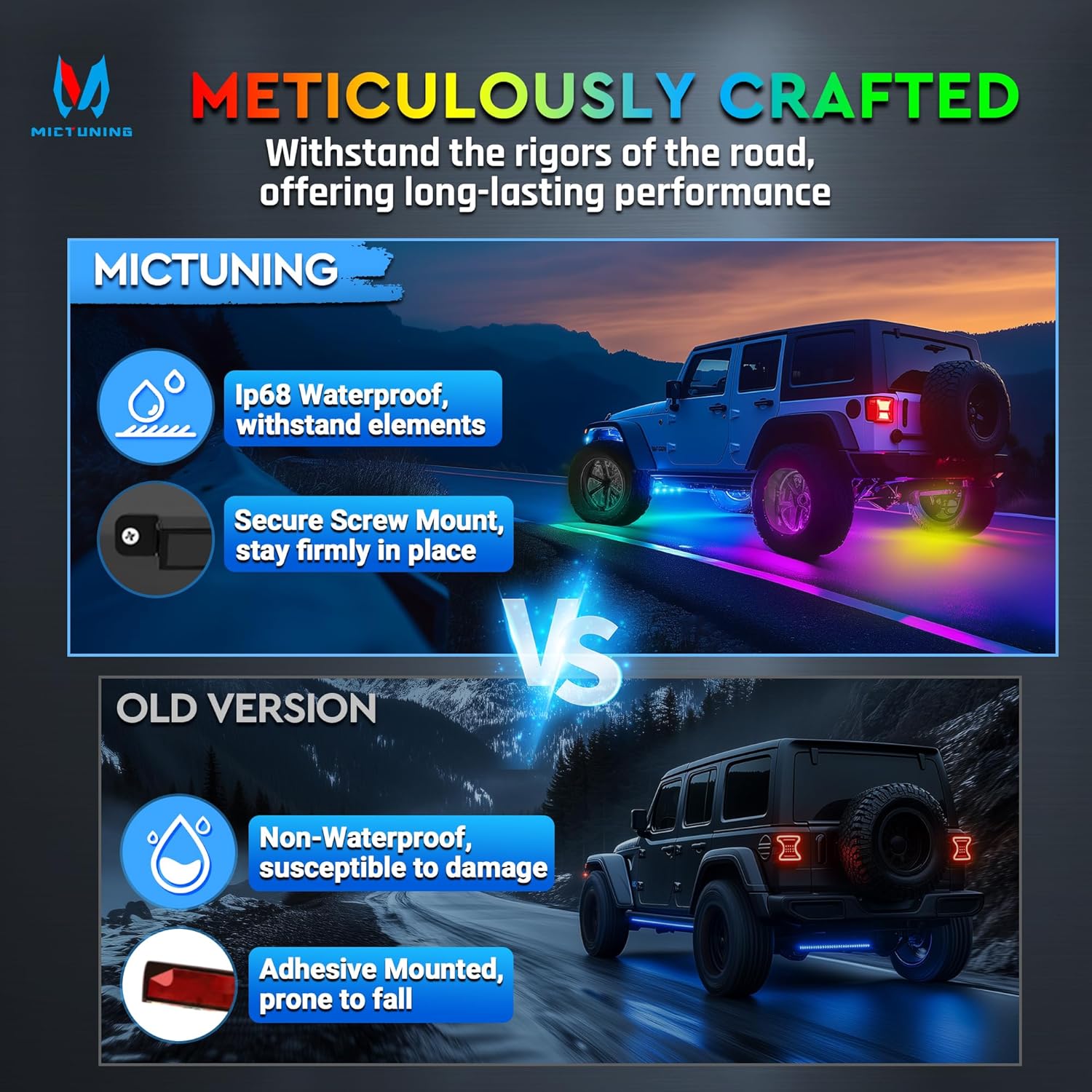 - ăDual Control for Total Customization ă- Enjoy full control with the MICTUNING app, offering numerous colors, 76 dynamic effects, 8 DIY patterns, music sync mode, and group control. For quick adjustments, use the included remote to change colors, modes, brightness, or turn the lights on/off effortlessly