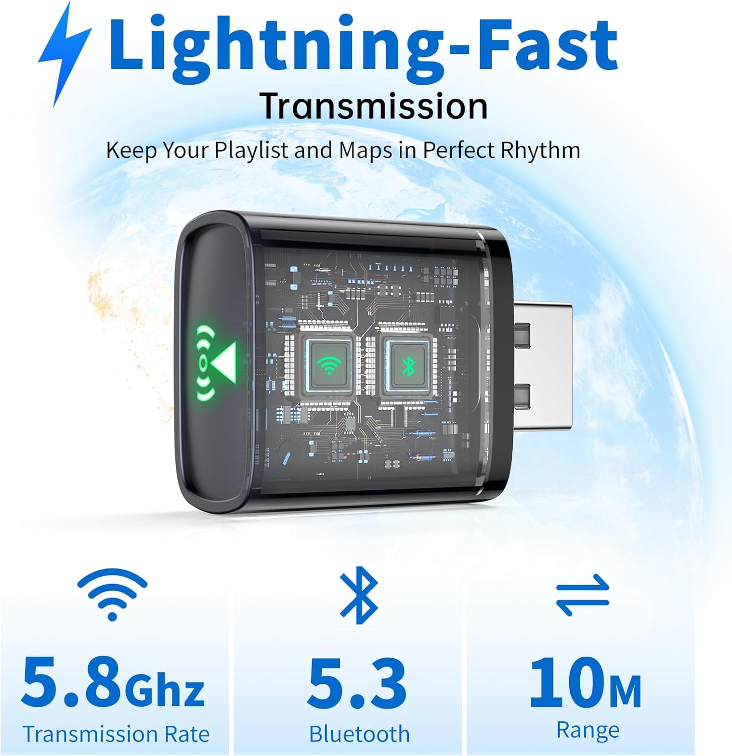 - đăLightning-Fast Wireless Connectionă Achieve 10-second initial setup and 3-second auto-reconnect with our Apple CarPlay wireless adapter. Equipped with 5.8GHz WiFi and Bluetooth 5.3, it delivers 5x faster transmission than standard adapters. Control navigation, music, calls, and messages seamlessly via Siri or touchscreen, buttons, or knobsâzero daily lag ensures safer driving. (Your Cars must support OEM wired CarPlay and USB C Port)