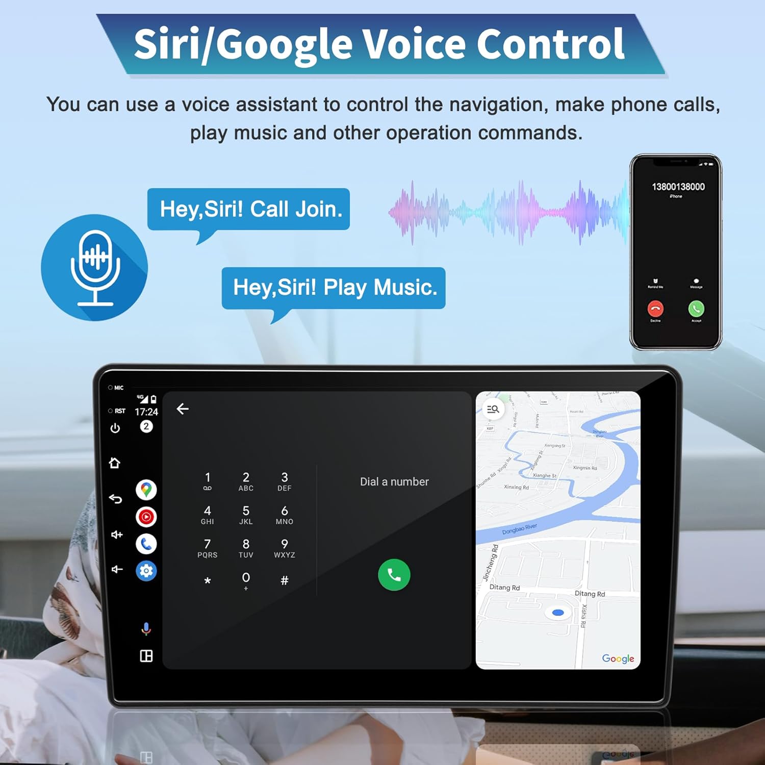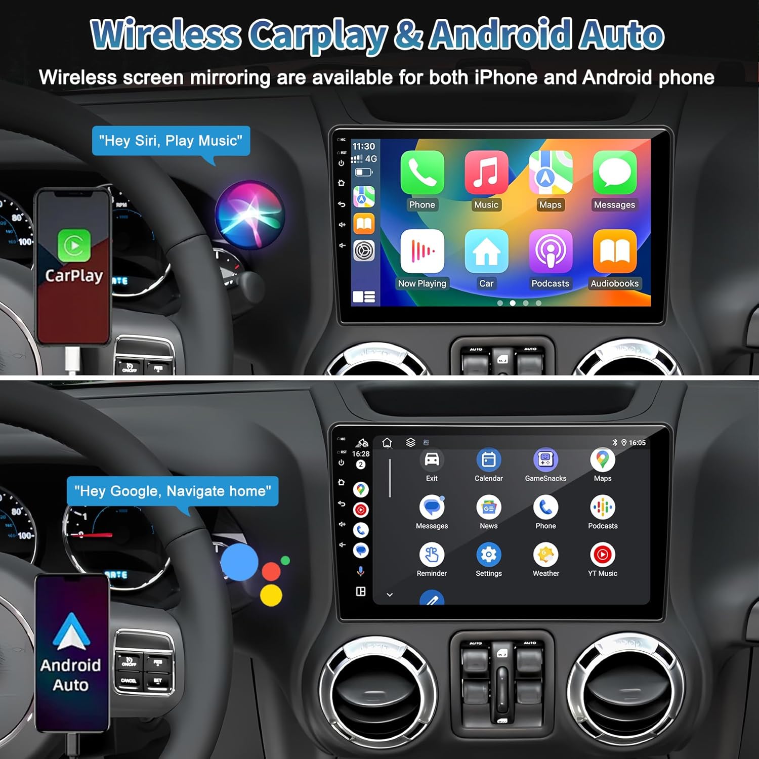- Wireless CarPlay & Android Auto: Easily connect your iPhone or Android phone to the car radio via Bluetooth or USB cable. Use the smart voice assistant or the touchscreen to get directions, make calls, send and receive messages, and enjoy music, all while keeping your focus on the road