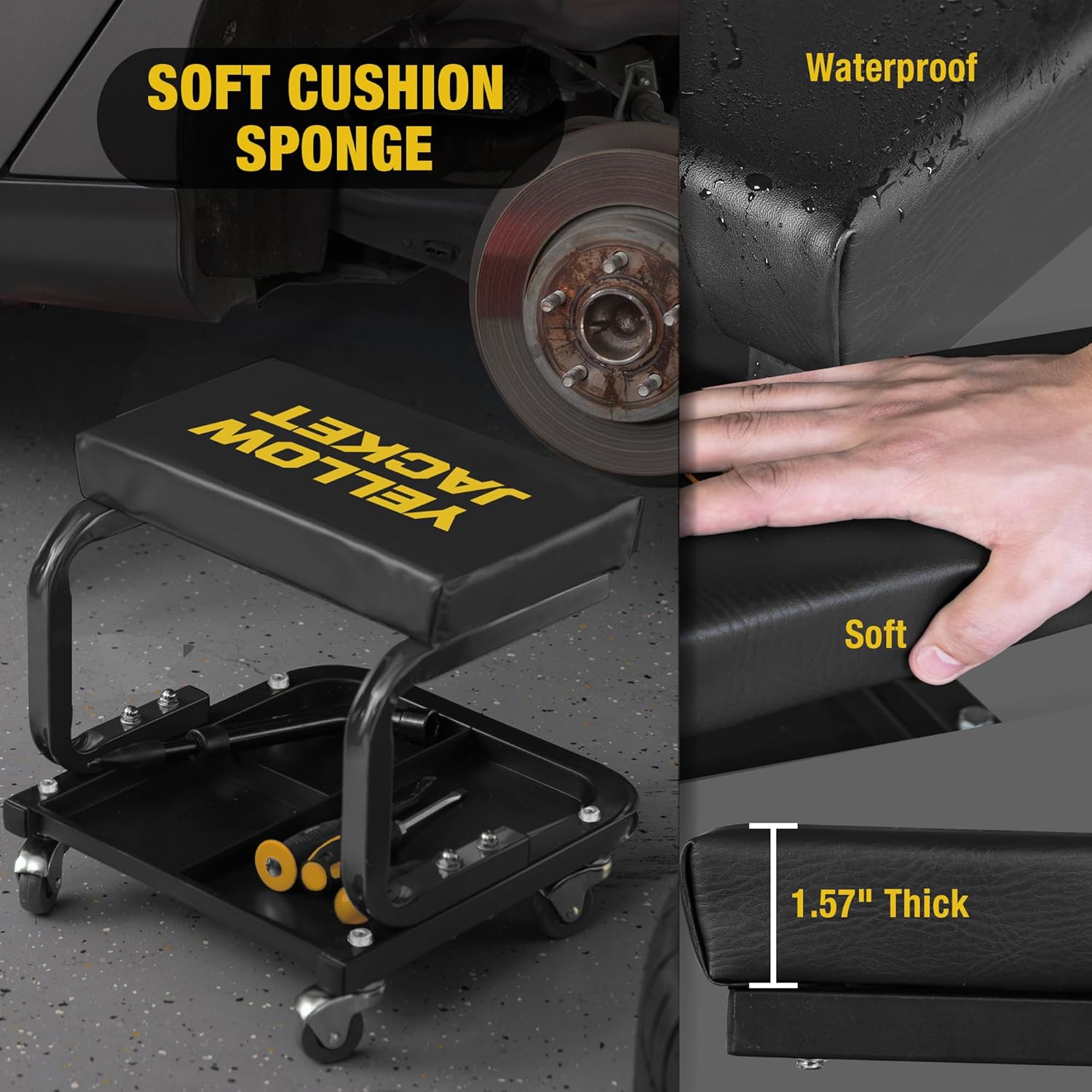 YELLOW JACKET Mechanic Rolling Stool 250 Lbs Capacity, Garage Stool on Wheels with Tool Tray Storage, Work Stools with Wheels for Garage, Shop, Mechanic Chair with Wheels, Auto Repair
