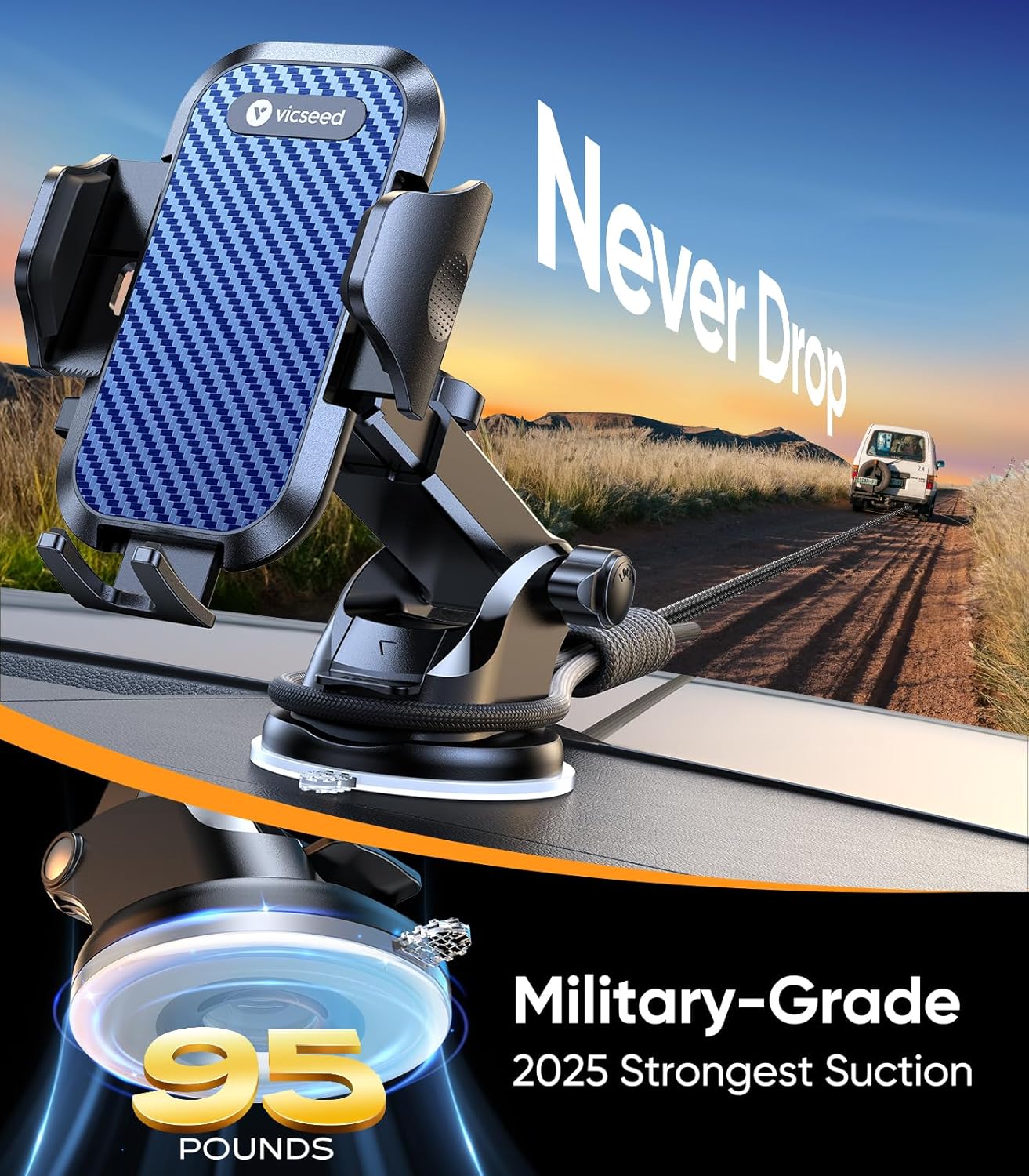 - [Super Strong Suction â No Falling, No Marks] 2025 upgraded car phone mount features a military-grade suction cup that holds 95+ lbs on your dashboard, windshield, or air vent. Unlike cheap mounts that melt or leave sticky residue, it leaves no residue and resists heat from -40°F to 194°F. Perfect for SUVs, trucks, taxis, and all cars, making it the most secure phone mount for car.
