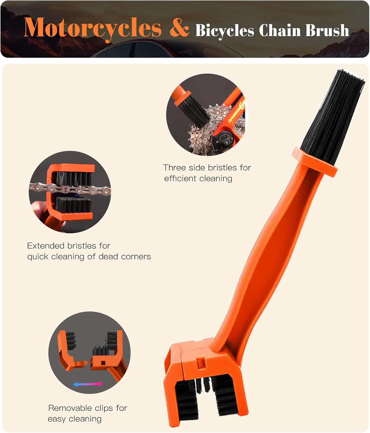 - MOTORCYCLE CLEANING BRUSH KIT: This comprehensive motorcycle cleaning kit includes the essential tools and solutions needed for every part of your motorcycle and bicycles, including painted surfaces, frames, mudguards, exhausts, engines, chains, detailing, rims and wheels