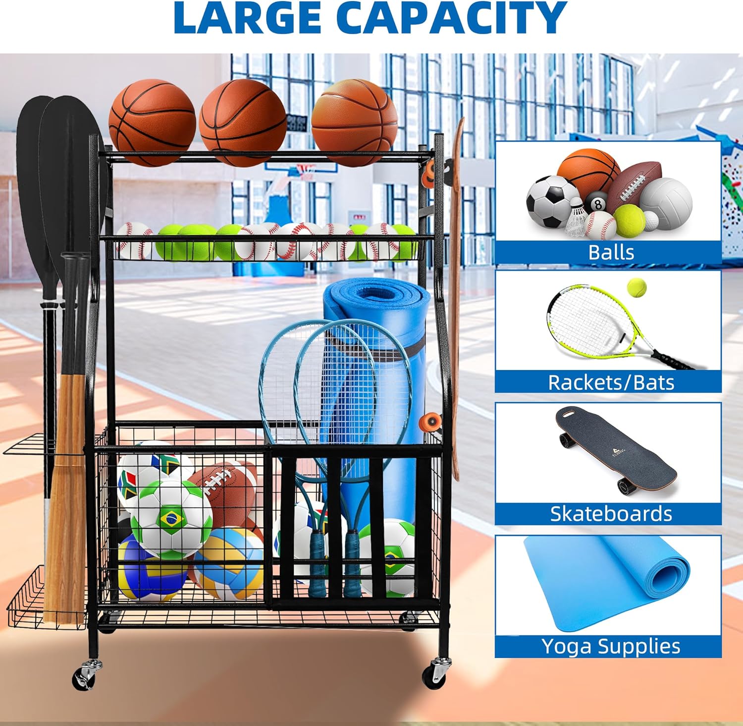 - [Used in Varies Place]Size: 36.1" L x 16.54" W x 45.71" H. The Rolling Sports Ball Basket features in 4 heavy-duty smooth rolling wheels, Indoor & Outdoor Design, which is easy to move the organizer anywhere and fits in a specific position. It is ideal for the garage, home, Storage room, playroom, gym, playgroup and schools