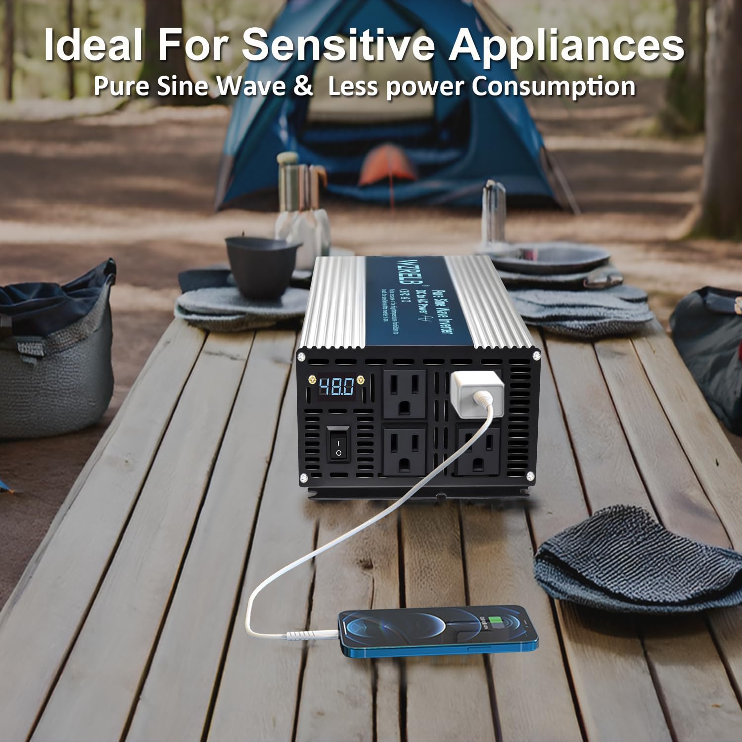WZRELB 1800W Pure Sine Wave Inverter 48V DC to 110V 120V AC,Car Power Inverter with 4 AC Outlets, LED Display,Off-Grid Portable Power Converter for Home, RV, Truck, Camping