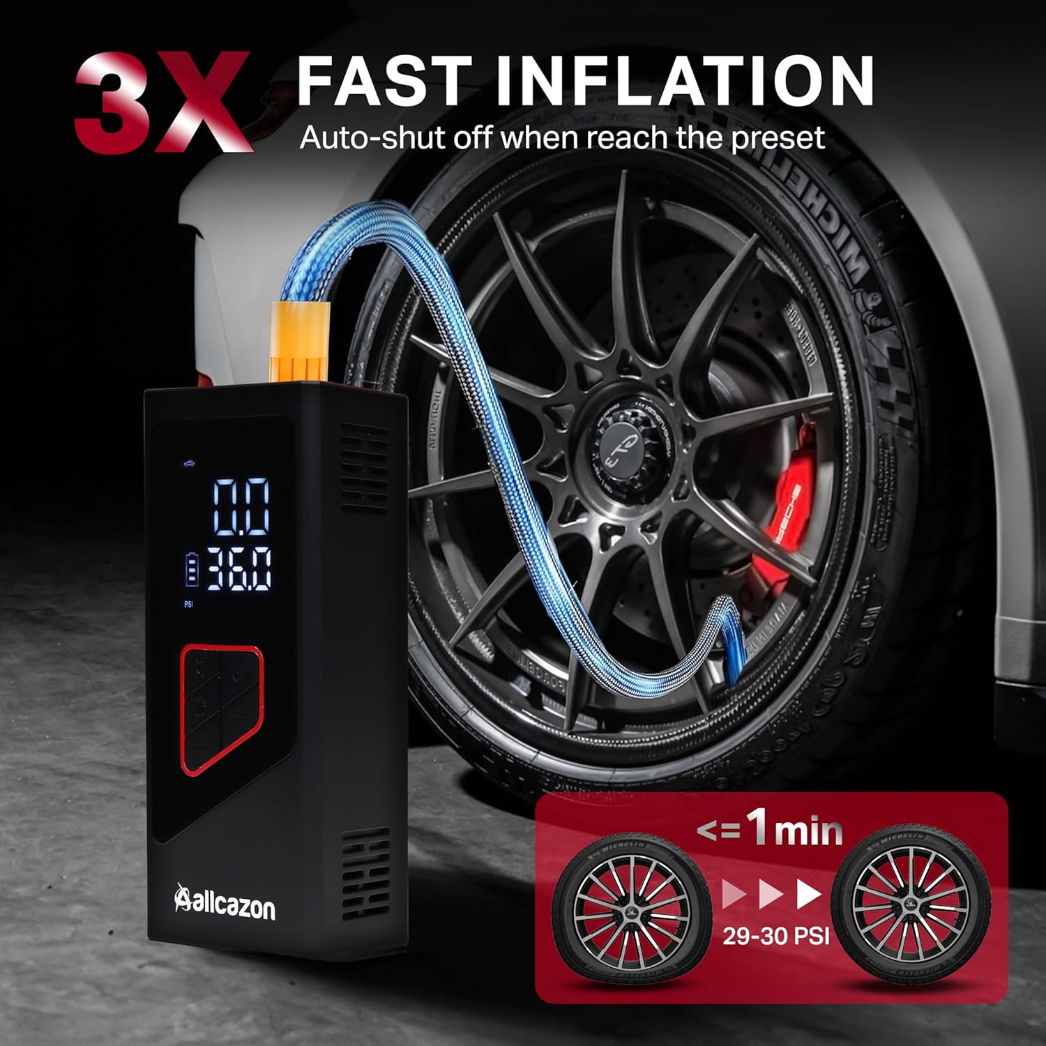 - Durable and Reliable Build for Long-Lasting Use: Crafted with quality materials, the ALLCAZON air compressor is built to withstand frequent use and travel conditions. Itâs a reliable tool to have in your car travel essentials for long trips, whether youâre headed out for a road trip or daily commute. Ideal for auto air compressor tire inflator needs and cool car accessories for men who appreciate quality and functionality.