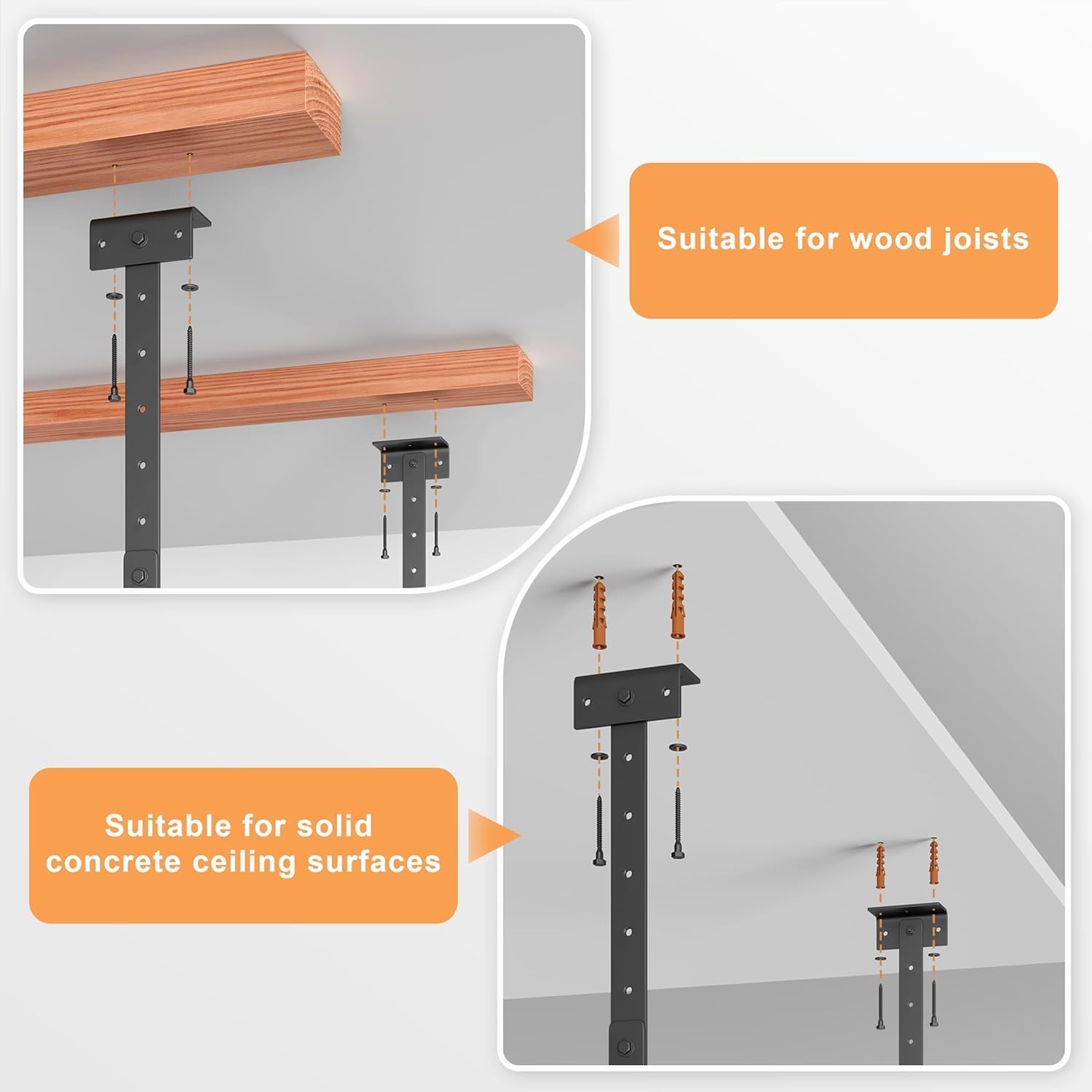 - 🔧【Quick Installation】- On any Ceiling Joists ≤42". Pre-drilled universal mounting brackets work with all standard joist spacing. No complex measurements – install this overhead garage storage rack in under 1 hour using basic tools.