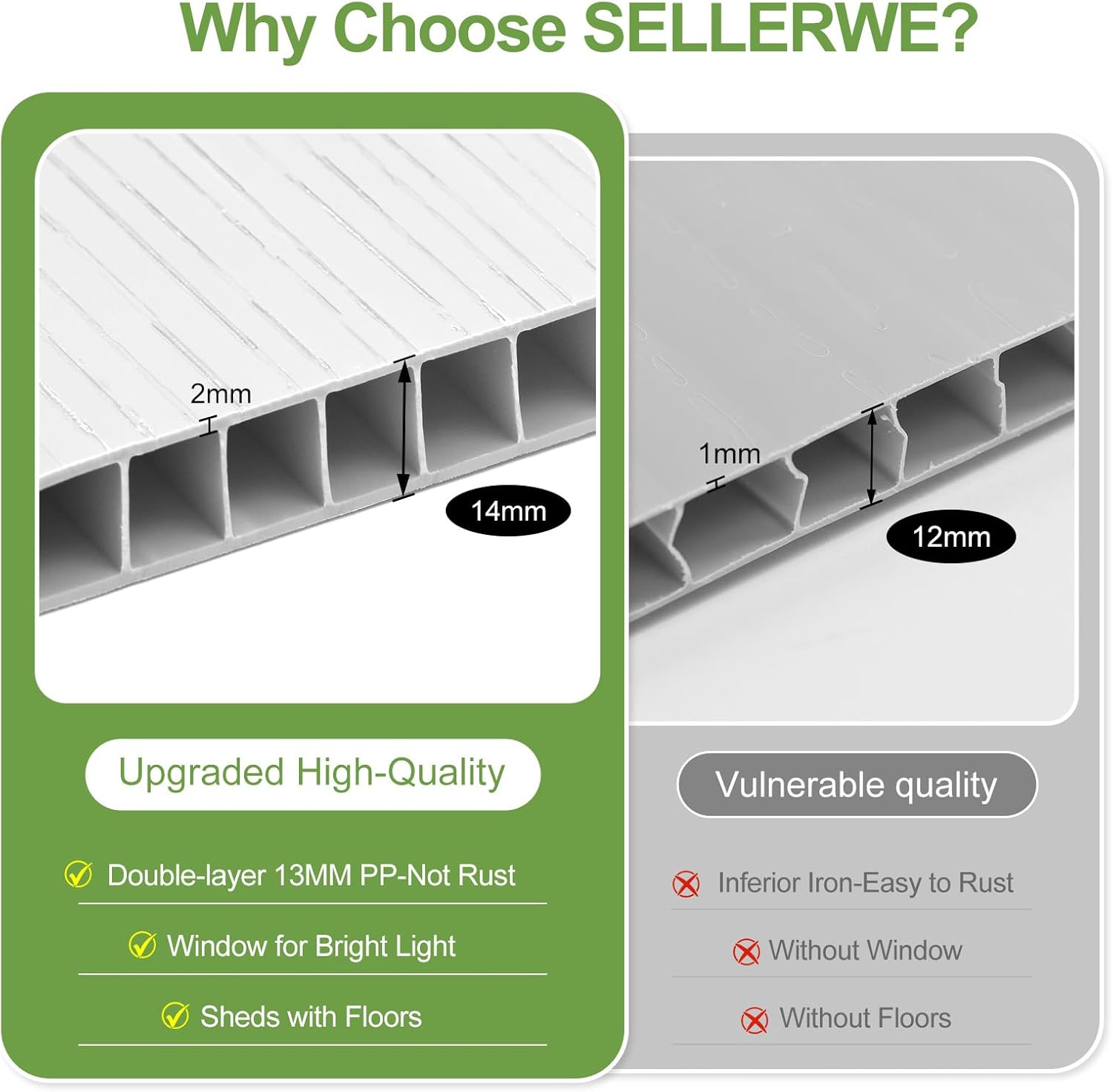 - 【Premium and Durable Material】The 14mm tough double-wall resin construction, 0.6 mm galvanized steel frame and impact-resistant floor are designed for long-term durability. The double-wall panels are waterproof and moisture-proof, allowing worry-free use in all weather conditions. It is weather-resistant, waterproof, and UV-resistant-no peeling, rotting, or rusting. The screws are embedded to ensure aesthetics and safety