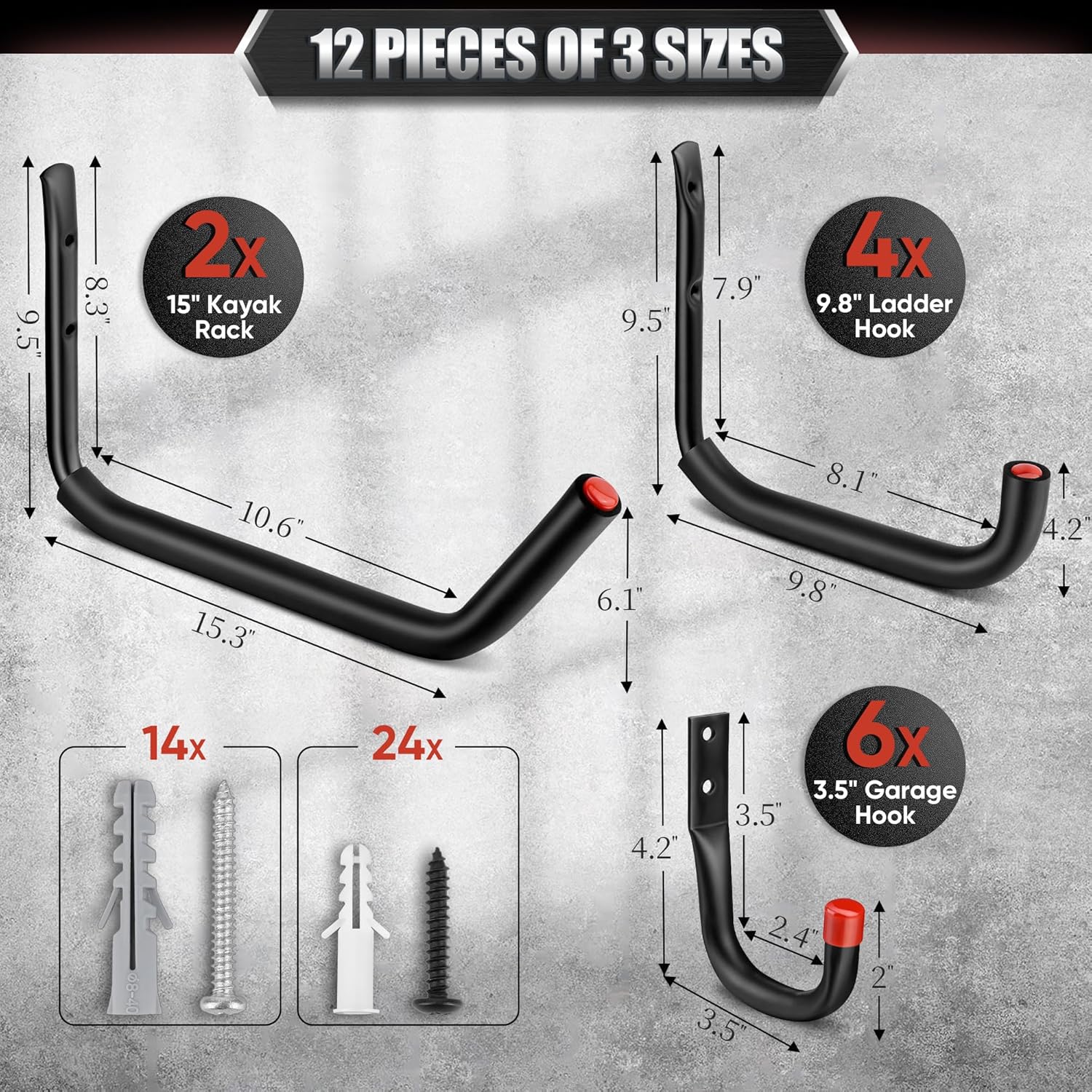 - Complete 12-in-1 Suite for Your Workspace: We provide 12 pieces of 3 sizes garage hooks for Hanging, including 2*15" Kayak hooks, 4*9.8" Garage hooks, 6*3.5" utility hooks. designed to create an efficient storage space for kayaks, paddleboards, snowboards, surfboards, canoes, folding chairs, ladders, garden hoses, tools, bikes, and other bulky items. Elevate Your OrganizationâGet Your Nacial Garage Hooks Today!