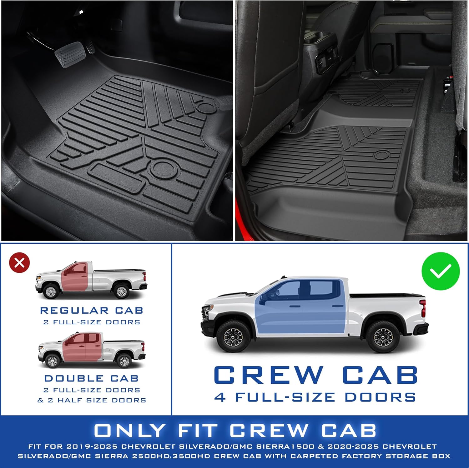 - Material Thermoplastic Elastomer (TPE) : Vehicle Service Type Fits for 2019-2025 Chevrolet Silverado 1500/GMC Sierra 1500 & 2020-2025 Chevrolet Silverado/GMC Sierra 2500HD/3500HD Crew Cab Fits for 2019-2025 Chevrolet Silverado 1500/GMC Sierra 1500 & 2020-2025 Chevrolet Silverado/GMC Sierra 2500⊠See more
