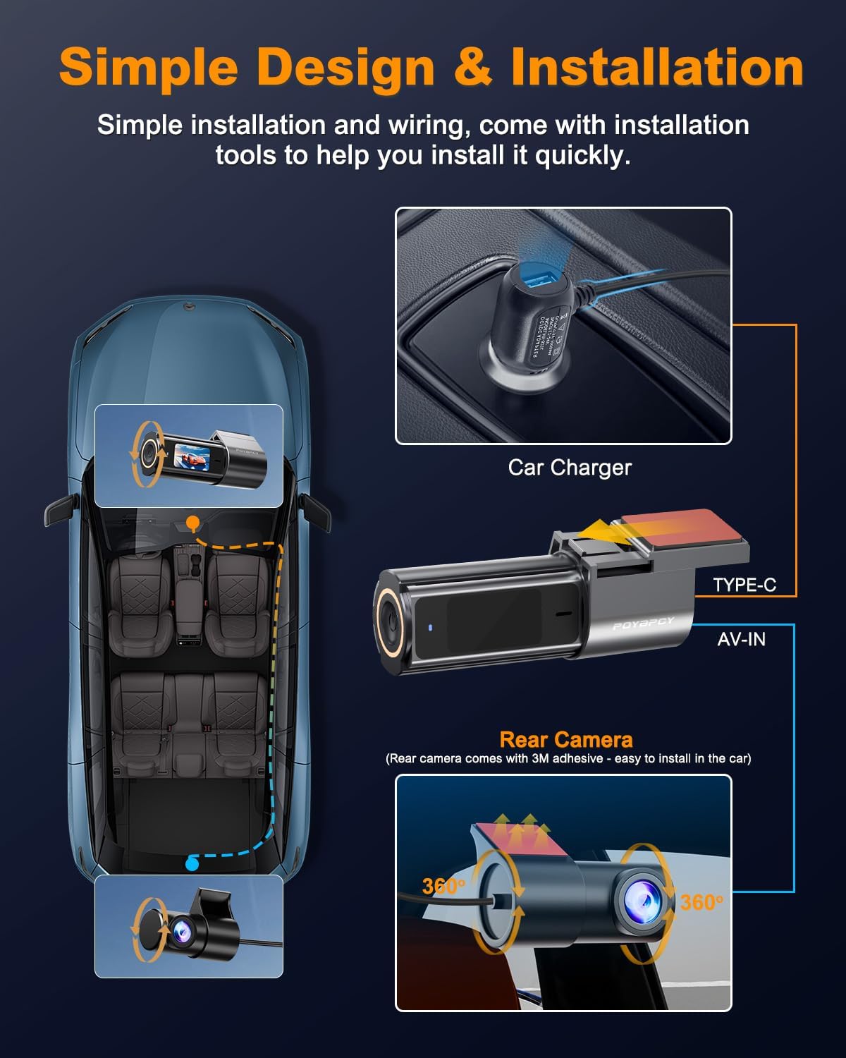 - ă360° Rotation & Built-in 5G WiFiăEasy to install. This dashcam front and rear camera can rotate 360 degrees and easily adjust to inside dash cam or any angle you want. Dash cam front and rear wireless has built-in 5G WiFi high-speed transmission and can be easily connected through the mobile phone application (available for Android and iOS). You can adjust the parameters of the car camera in the APP, and you can also view and share your video files to your social media, friends and family