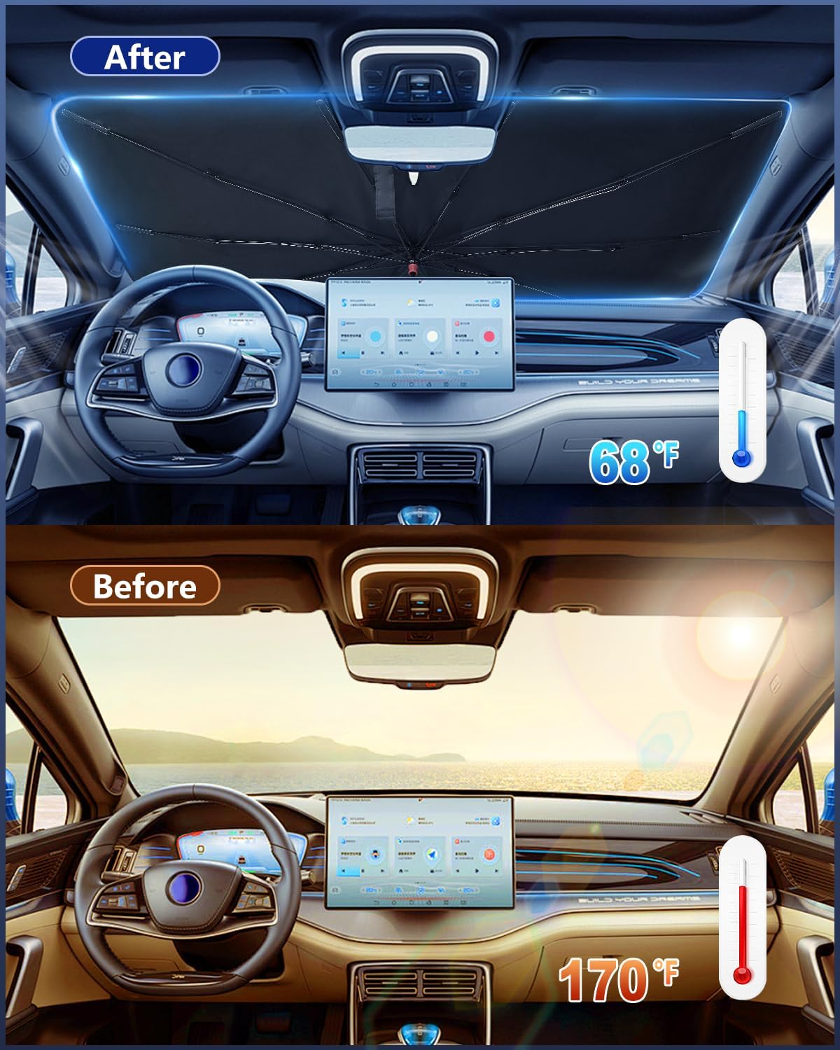 - 【Easy to Use and Store】 Simply push and open it like an umbrella to shield yourself from intense sunlight. When folded, it fits into the included storage bag, making it compact and convenient for any storage space in your vehicle.