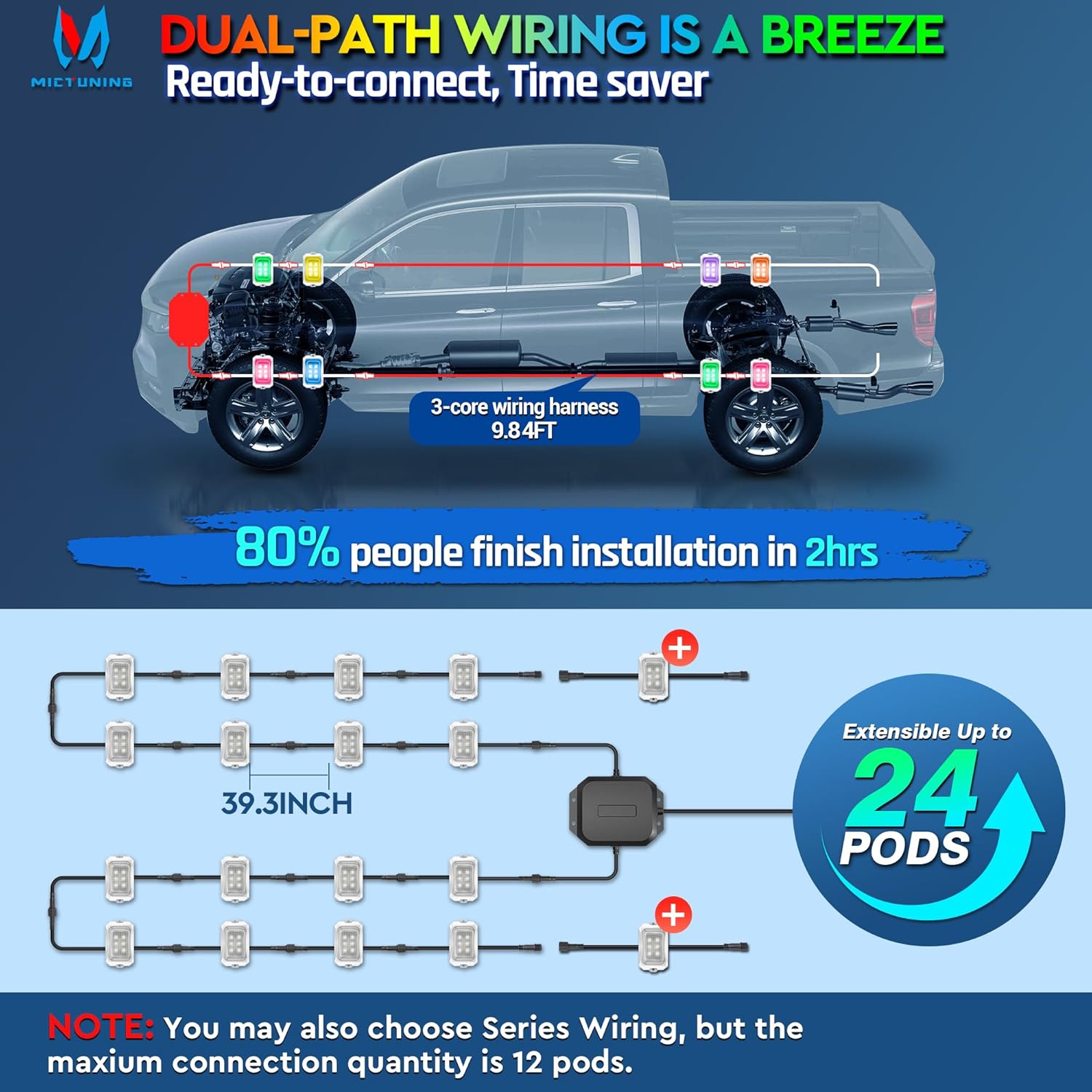 - Dual-Path Wiring Options - Ready-to-connect, time saver. Choose between Series or Parallel Wiring(Recommend). Can be connected up to 24 light pods with RGB individual chips for dynaimc colorful display. (Note: Each side's maximum limit is 12 pods. Additonal Pod pls search Asin :B0CJYDB25Y)