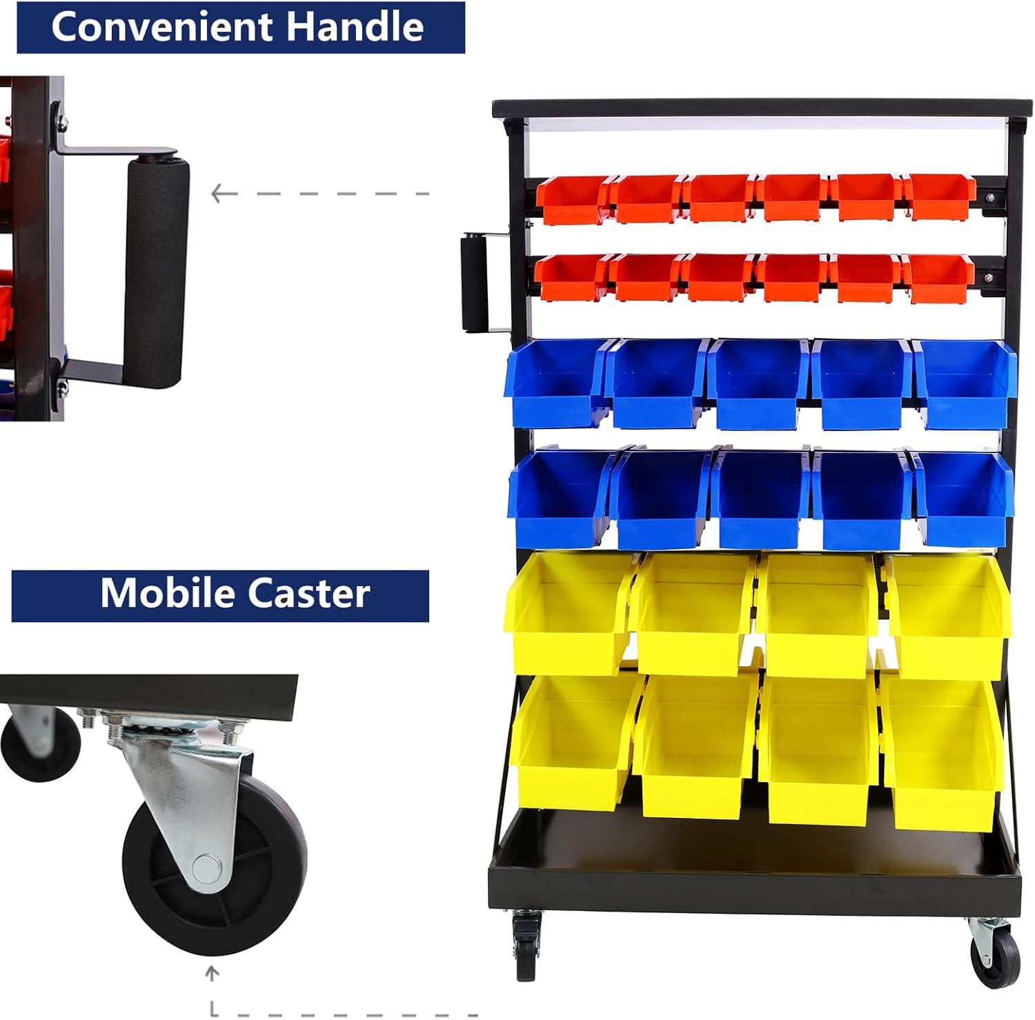 - Robust Constructionand Enhanced Mobility: Crafted with a sturdy steel frame, our mobile bin rack ensures durability and stability.Take advantage of lockable casters for effortless maneuverability, ensuring your storage stays secure and accessible.