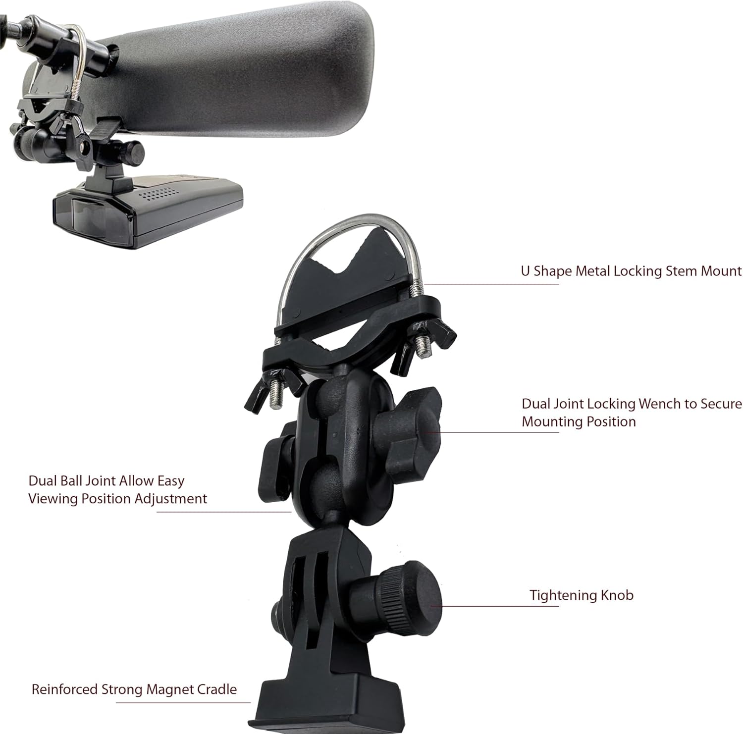 Newly Revised M1 M2 Camera Compatible - UBolt Rearview Mirror Stem Mount w/Magnetic Cradle for Escort IX IXc Max360C MKII Max3 Max4 MaxCam Redline EX GT360 Cobra DualPro RAD700i Radar Detectors