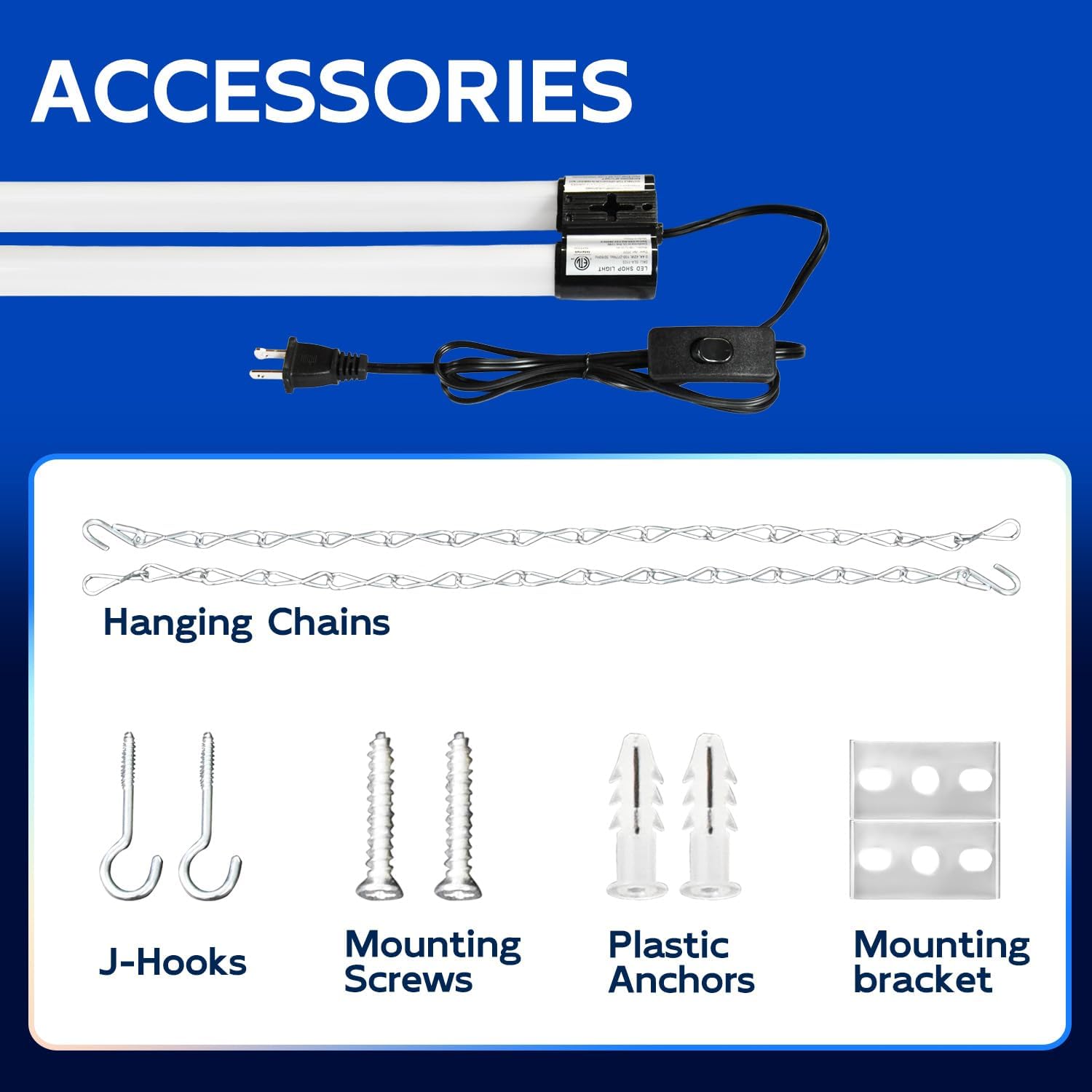 - ✅ Easy Installation - Plug & Play. Come with 59" power cord with on/off switch and other small accessories. You can hanging it with the included hanging chains or directly mounted to the ceiling with the included mounting screws.