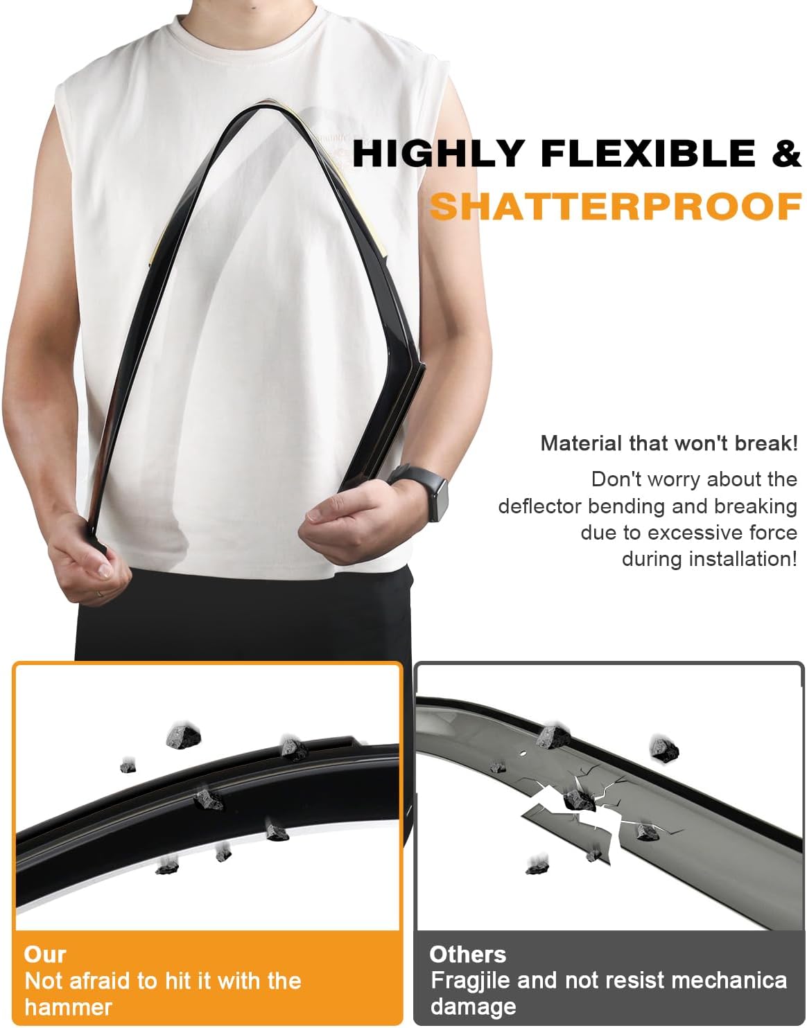 - ăExtra-Durable PolycarbonateăDeejecsun Window Deflectors made of long-lasting shatterproof material, offer ultimate protection against heat, wind, rain, and environmental damage, ensuring a safe and comfortable journey .