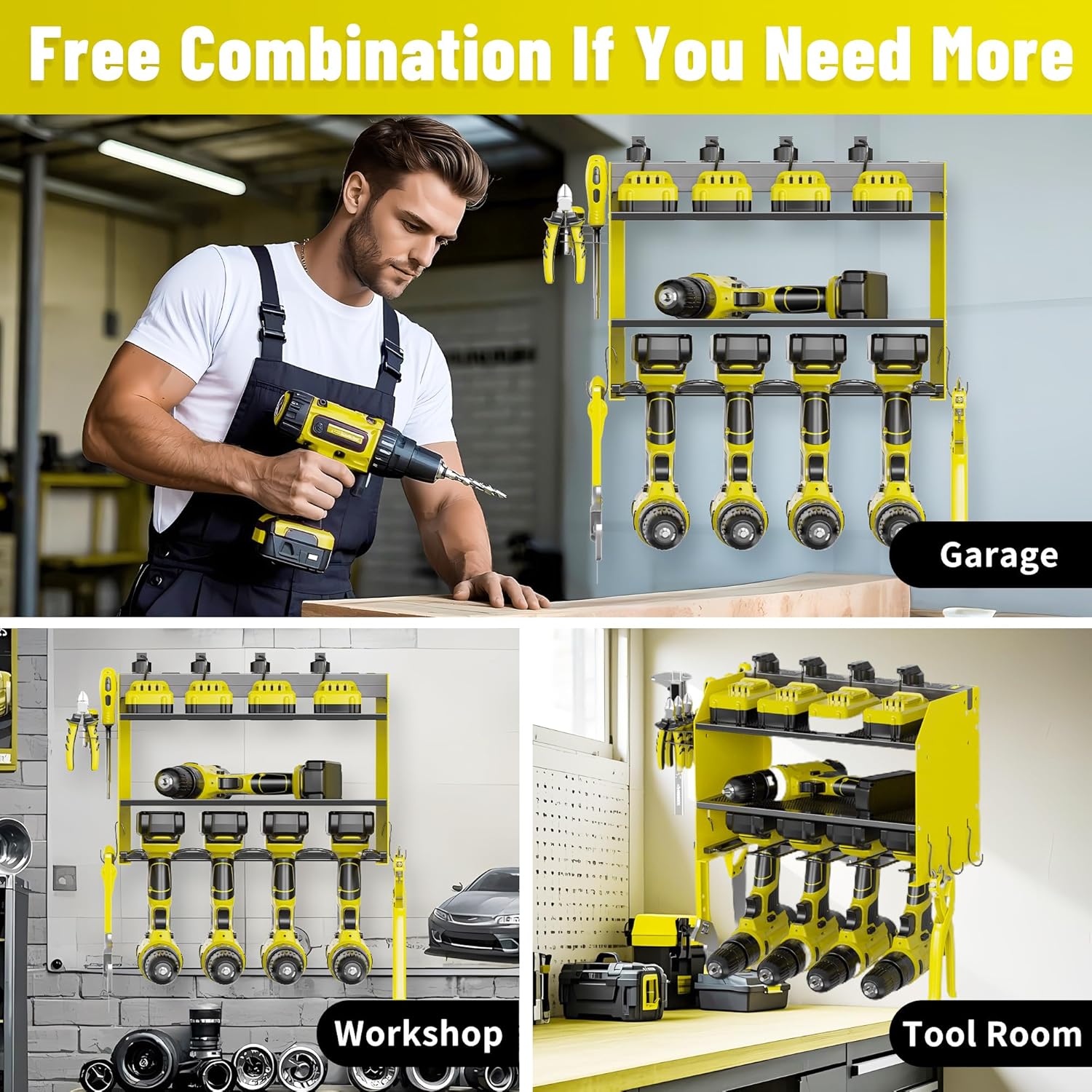3-Tier Modular Drill Holder & Power Tool Organizer Wall Mount with Charging Station, Tool Storage Rack with Hooks, 8-Outlet Power Strip, Bit Rack & Cordless Garage Tool Organization (Yellow)