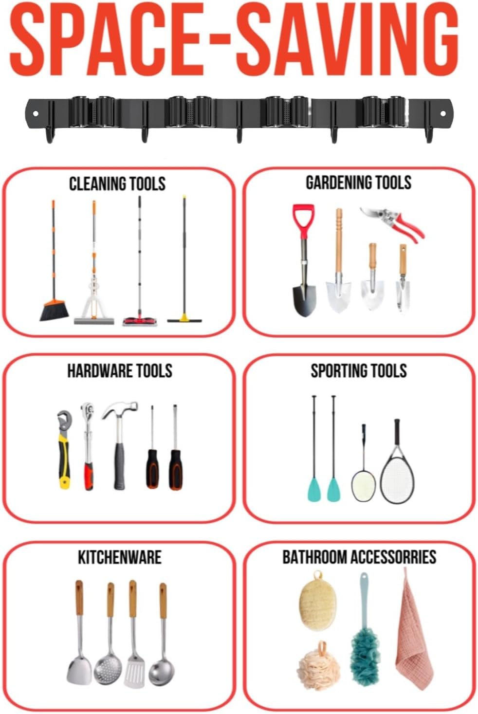 - VERSATILE STORAGE: Each holder features multiple slots and hooks to securely grip handles of different sizes for brooms, mops, rakes, and other tools
