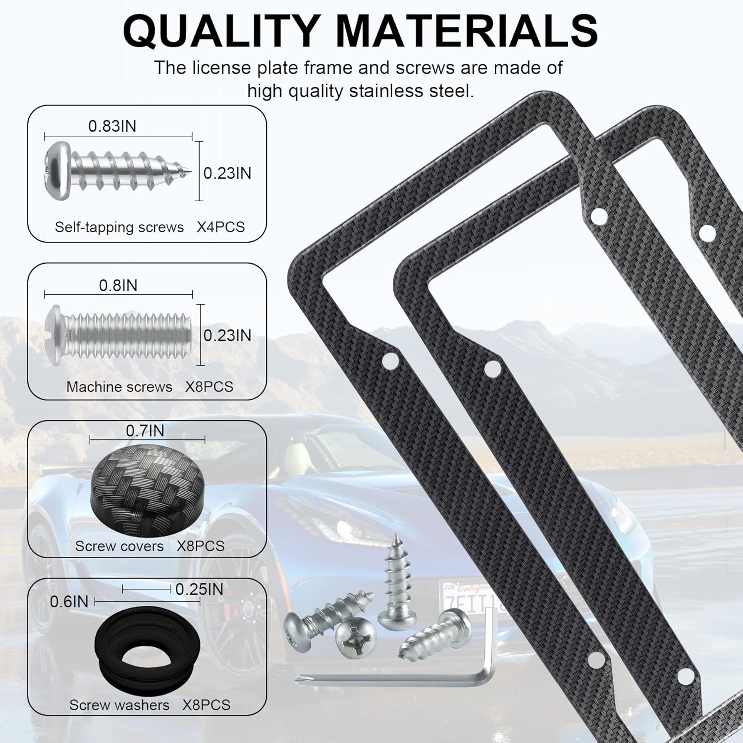 - 【Complete Installation Kit】 Includes 2 license plate frames and all the necessary accessories: 8 plastic screw caps, 8 plastic washers, 8 machine screws, 4 self-tapping screws, and 1 screwdriver. This all-in-one kit ensures easy and secure installation.