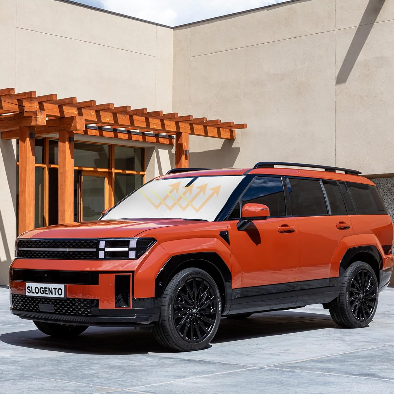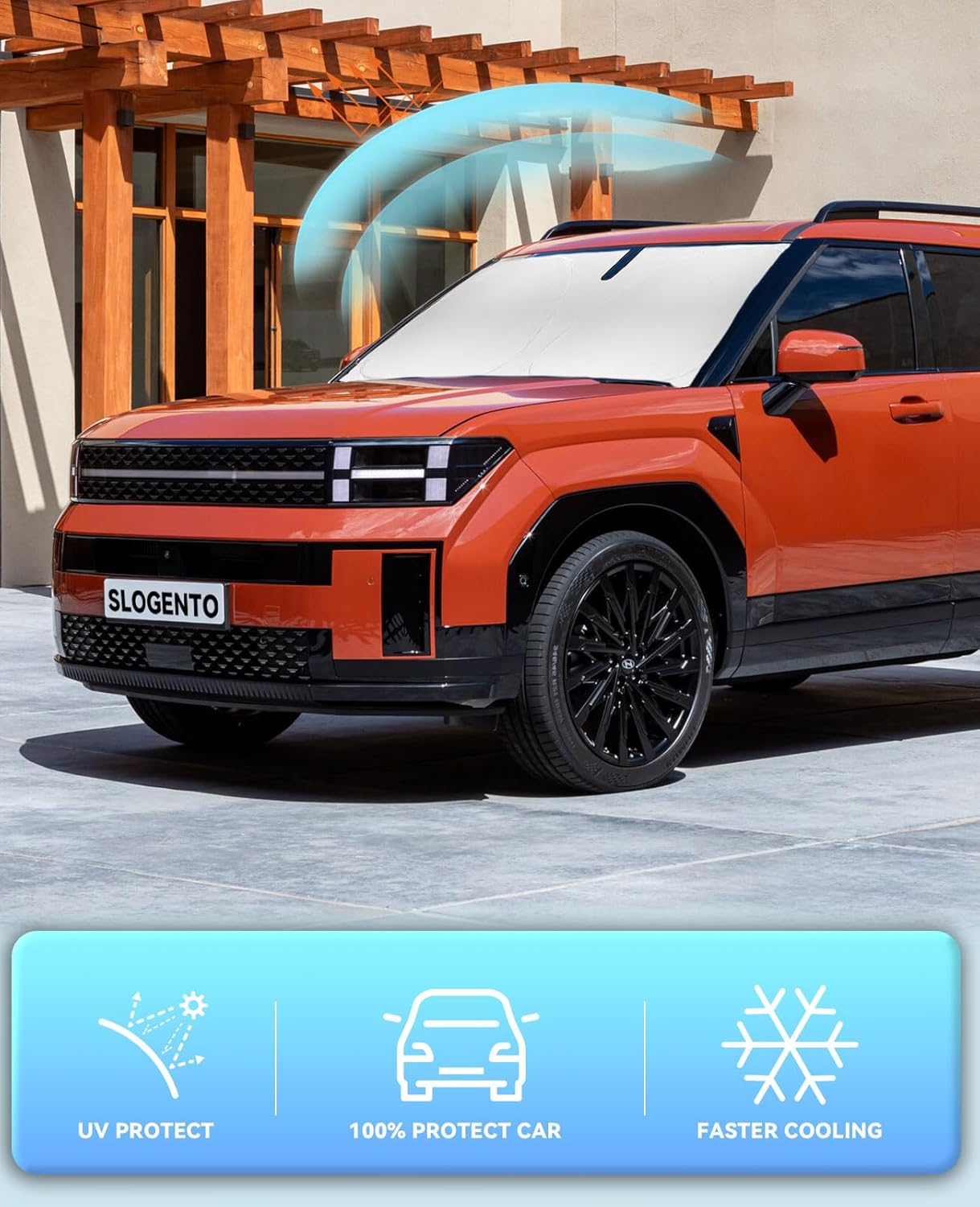 - ăVehicle SpecificăOur Windshield Shade Cover custom fit for 2019 -2024 2025 2026 Hyundai Santa Fe,Full covered your windshield,No Gap,100% Perfect fit. The precise fit design and reinforced steel ring are sufficient to allow the sun shade to precisely fit the front window without the need for suction cups to hold it in place, effectively protecting your car from the sun's rays.