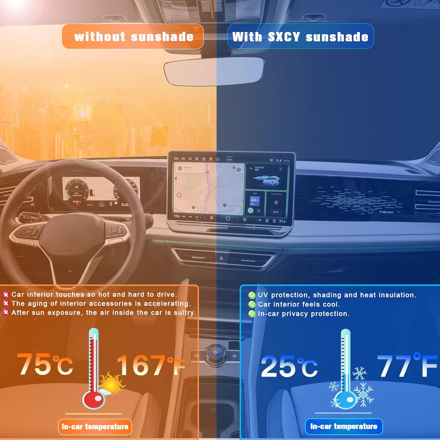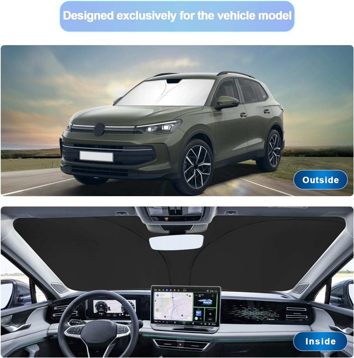 - 1.Custom Fit: this windshield sun shade is custom designed for 2025 VW Tiguan sunshade for 2025 Tiguan accessories front window.You donât need to worry about oversize or too small,consider it if you need a car protector cover that protects your car interior from sunburn.