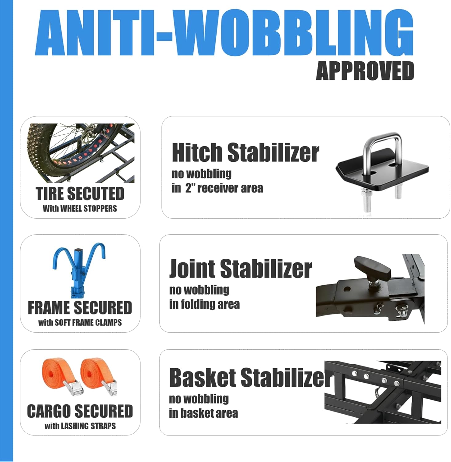 - SAFE & STABLE: Soft frame clamps, 2 lashing straps and wheel stoppers keep bikes and cargos safe during transport. Three stabilizers prevent rattling and wobbling on the road