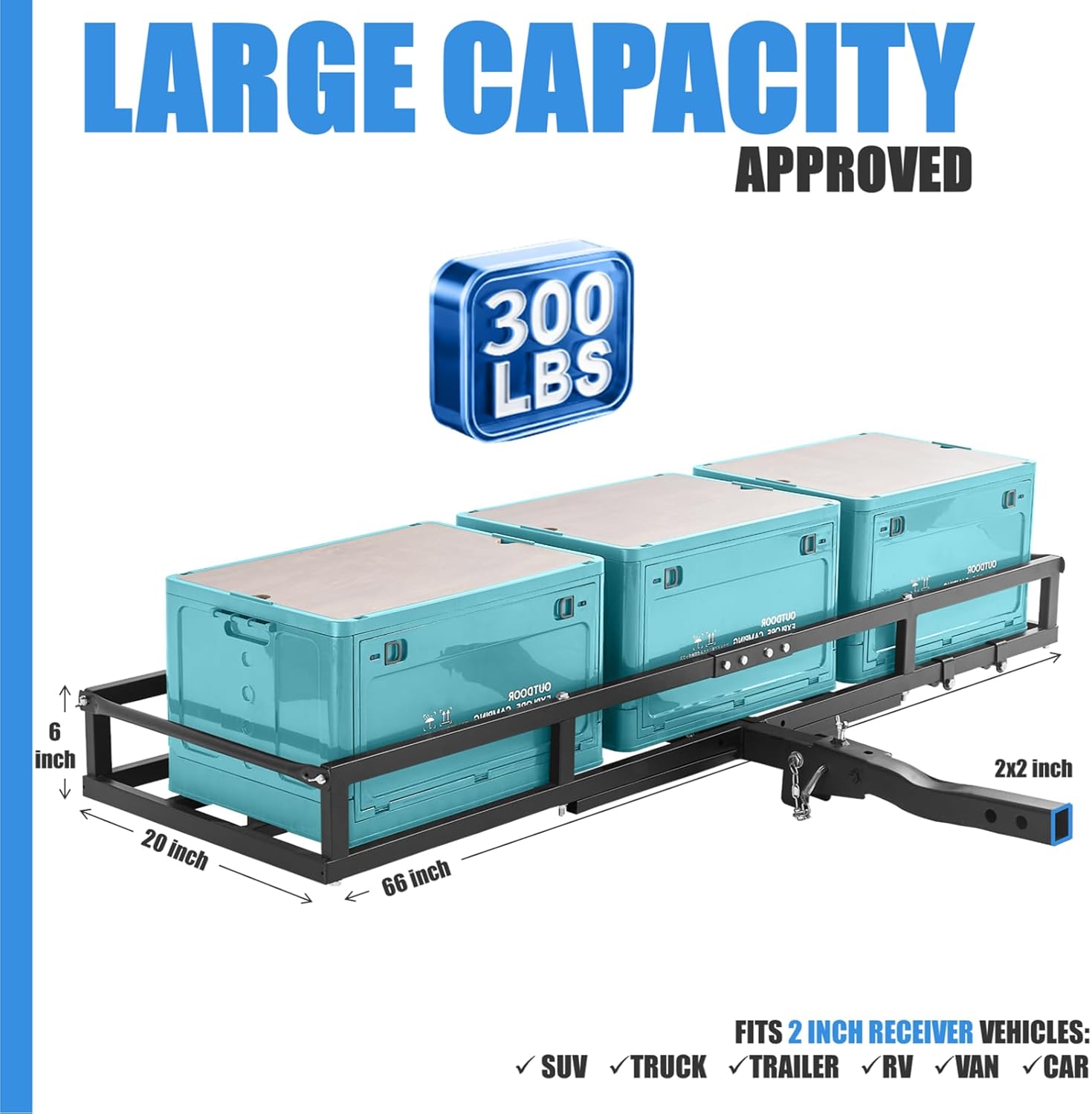 - LARGE HITCH CARGO CARRIER: Ideal for travel trailers and outdoor adventures, as a hitch rack, it boosts your vehicle's storage capacity during travel. As a hitch cargo rack, it measures 66x20x6 inches, offering ample space and strong load-bearing capability to haul camping gear, travling items and more, up to 300 lbs