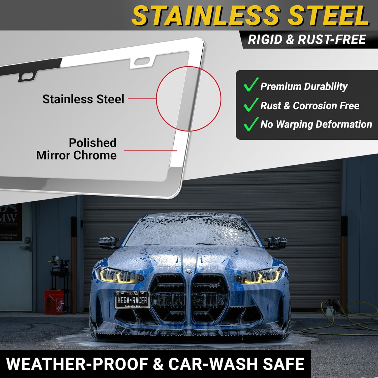 - STRONG DURABLE QUALITY: Our 1 pc License Plate Frame Chrome Holder is made strong to uphold anything from car washes to weather changes. Mega Racer's chrome license plate frames are RATTLE PROOF and RUST RESISTANT keeping your vehicle paint SCRATCH FREE.