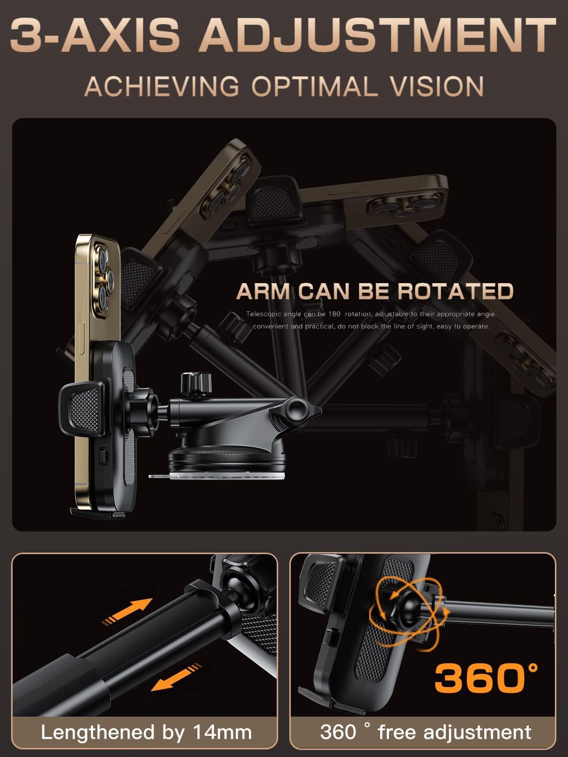 - 【Perfect Flexibility】Our car phone mount offer the ultimate flexibility with 360° rotation. You can easily adjust the angle to achieve the perfect viewing angle for your needs. Additionally, the suction cup holder with telescopic arm that allows you to adjust the height. No matter where you prefer to install them in your car - whether it's the dashboard, windshield, or air vent - it can be easily mounted in various ways. With their large movable range, they are compatible with all car models.