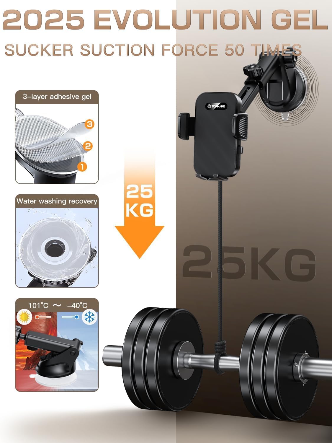 Topmake Car Phone Holder Mount,【2025 Upgrade】 3-in-1 Cell Phone Holder for Car, Dashboard Windshield, Suction Cup Hands-Free Car Phone Stand, Automobile Cradles Universal,Black