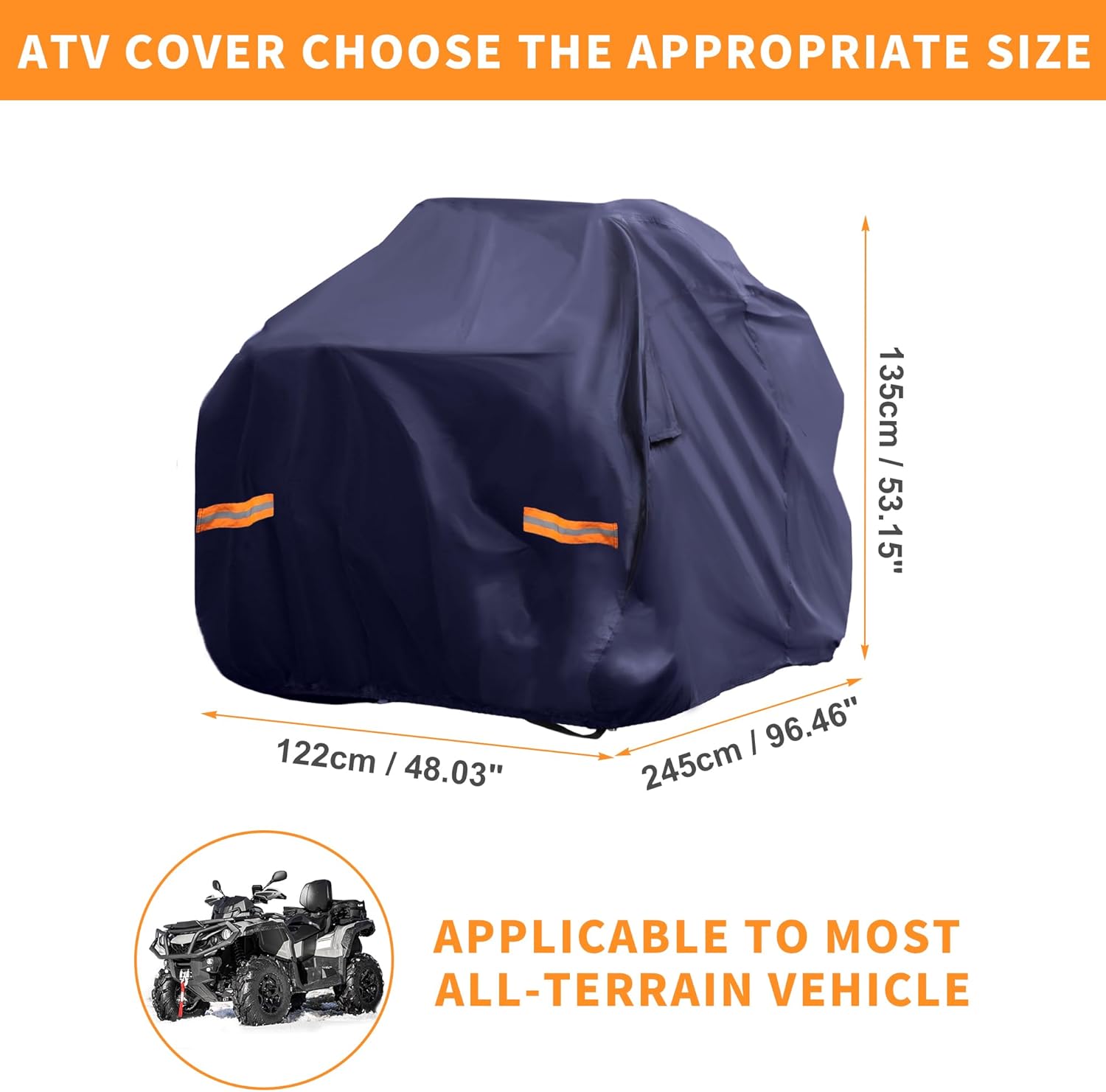- Full Protection: Our cover protects your ATV from dust, high temperature, fallen leaves, bird droppings and bad weather damaged. And it will not crack in cold weather, protecting the ATV from sun, rain and water damage. Whether it is placed outdoors or indoors, the four-wheeled vehicle can be kept clean and not easy to be harm.