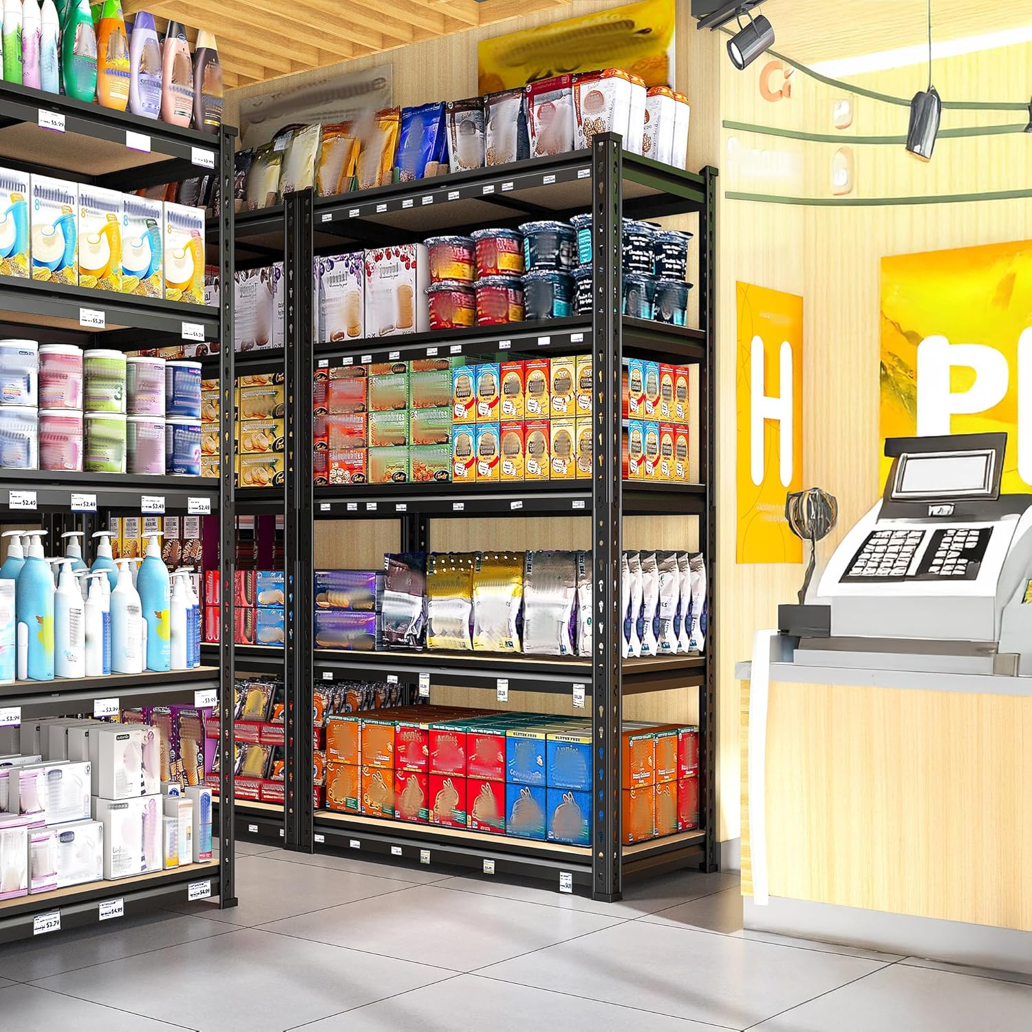 - ă11.8"D x 27.6"W x 60"H Multifunctional Heavy Duty ShelvingăThe perfect size metal shelf is suitable for garage, pantry, closet, kitchen, warehouse, basement, living room, office, study, and other different spaces. The shelves not only expand your storage space and make your home more clean, but the open space allows you to find items at a glance